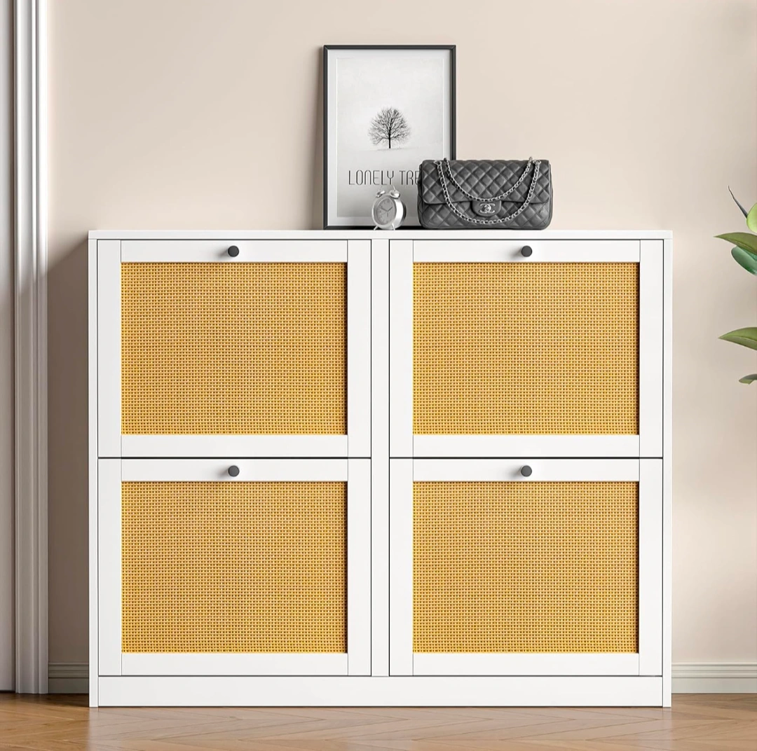 White Shoe Storage Cabinet with Rattan Doors