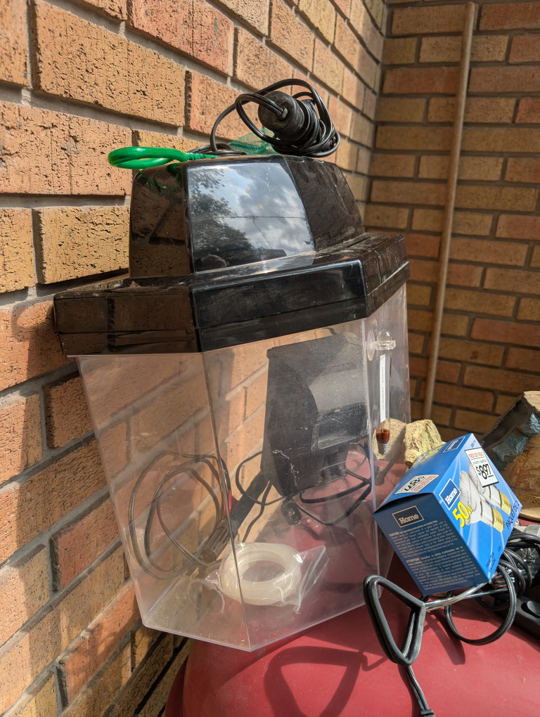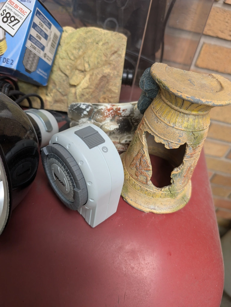 Selling a used fish tank that comes with various accessories! Included are a filter, heater, timer, decorative rocks, and a light bulb. The light bulb box shows a price of $8.97.