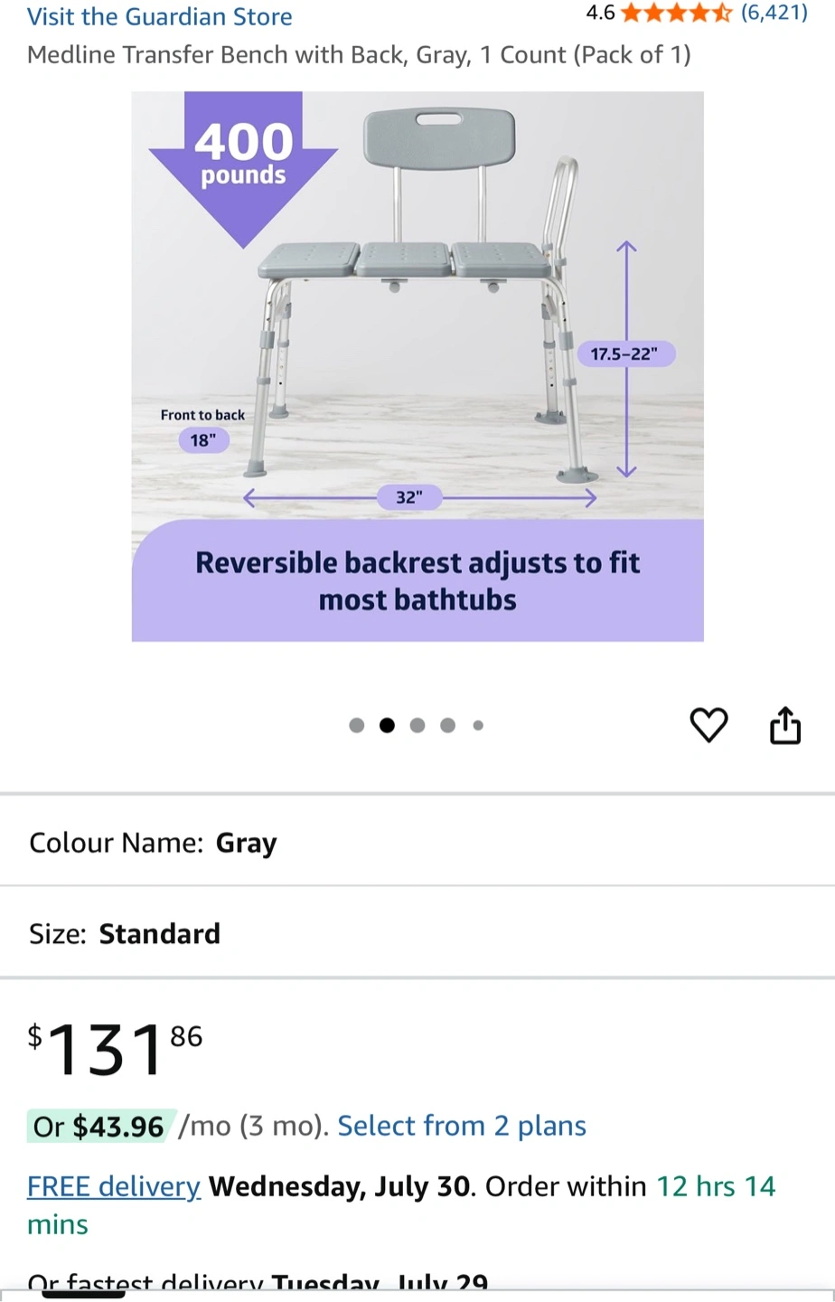 73Selling a brand new Guardian Deluxe Bariatric Transfer Bench in its original box! This bench is designed to provide a safe and comfortable transfer experience. It features: - Reversible backrest that adjusts to fit most bathtubs - Sturdy construction that can support up to 400 pounds - Gray colour and standard size - Originally bought for $131.86 It's a great addition to any bathroom for those needing extra support