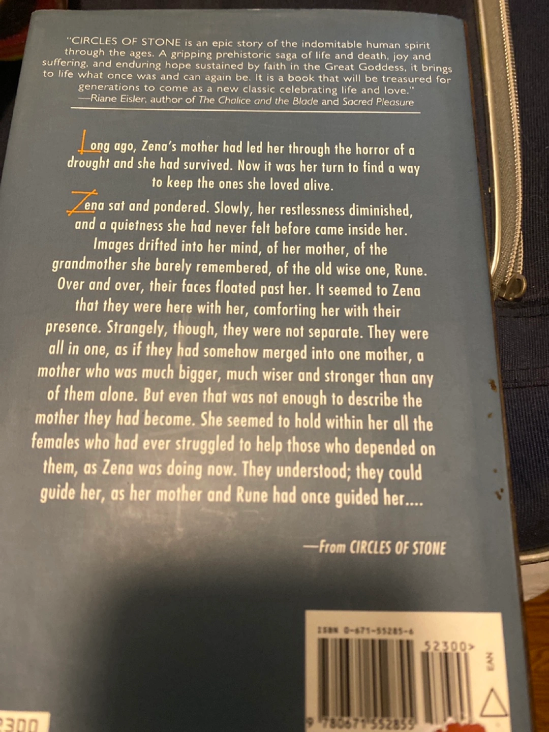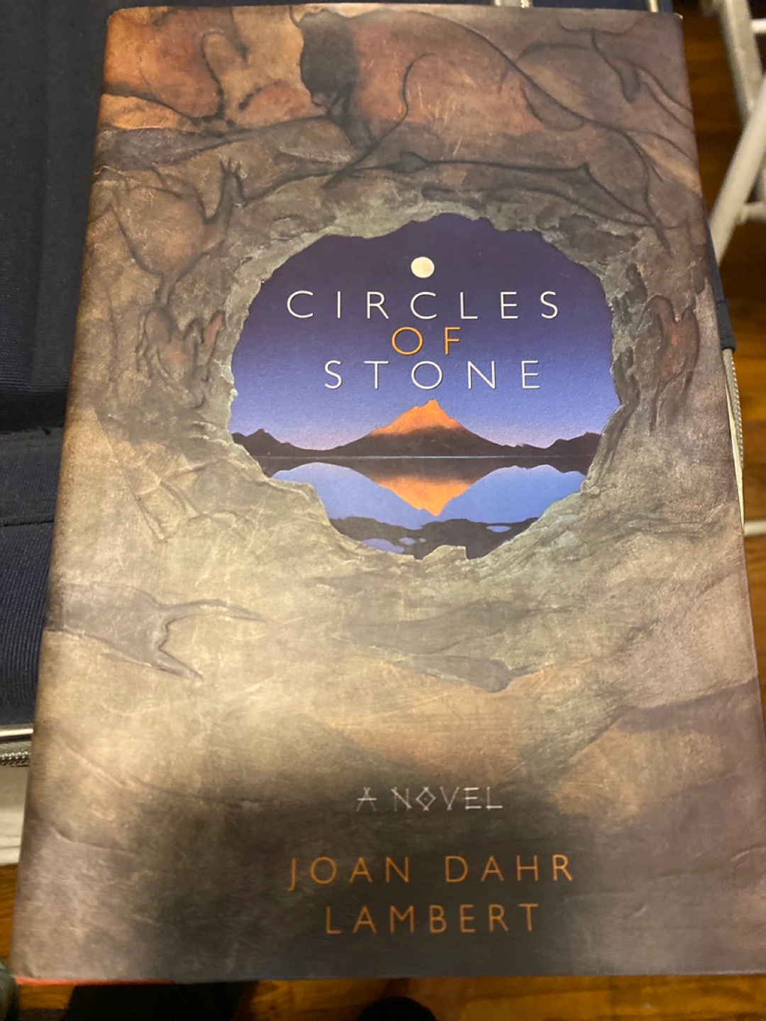 Hard cover novel Circles of Stone by Joan Dahr Lambert. It's an epic story of the indomitable human spirit through the ages. A gripping prehistoric saga of life and death, joy and suffering, and enduring hope sustained by faith in the Great Goddess