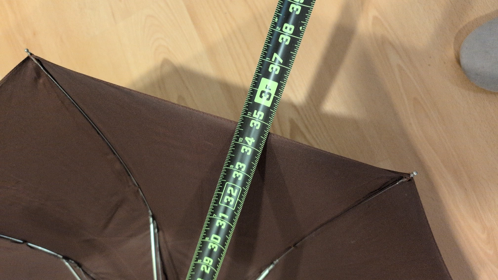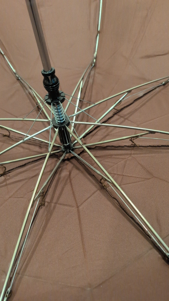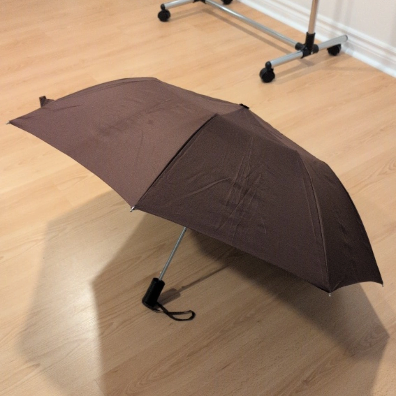 Simple maroon coloured umbrella with wrist strap. 1 button press to open. Collapsed by hand. No visible rust.