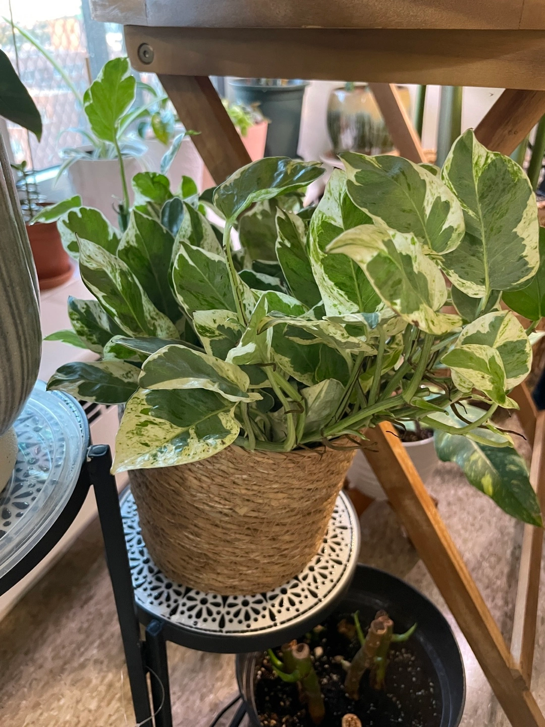 This is a lovely pothos plant in a woven pot. It's perfect for adding a touch of greenery to your home or office. The plant is healthy and well-cared for, and the pot is in great condition too
