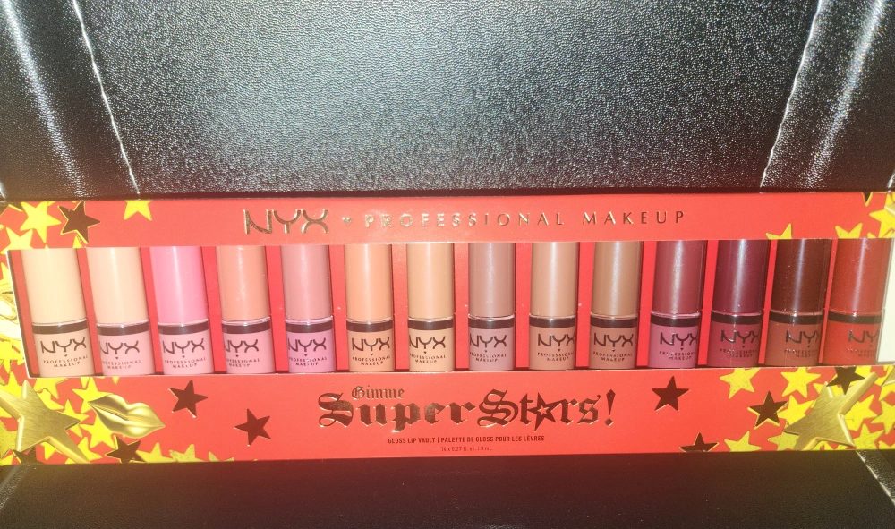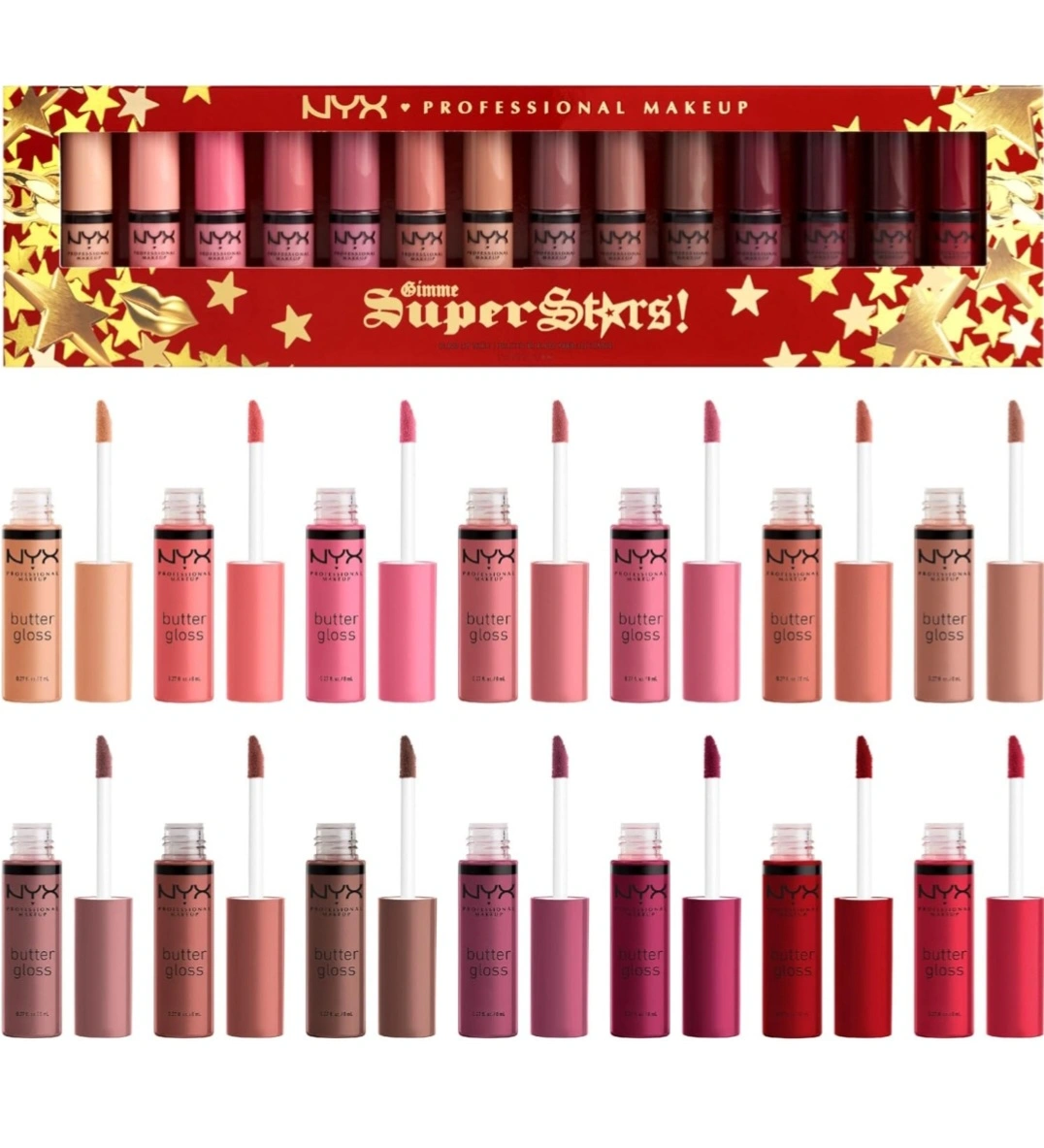 Brand new NYX Gimme Super Stars! butter gloss wardrobe. This set features 12 full-size shades of NYX's Butter Gloss, offering a variety of colours from nudes to reds for any occasion. Never opened and ready to give your lips a star-studded makeover!