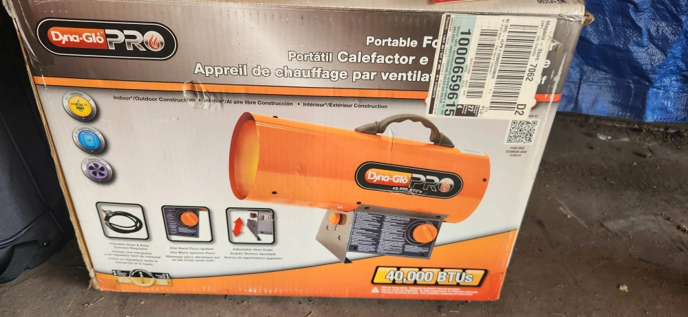 Selling a Dyna-Glo PRO portable forced air heater, perfect for indoor or outdoor construction. It's a 40,000 BTU unit and includes hose and easy connect regulator. The box is included. the ignite switch is touchy sometimes.