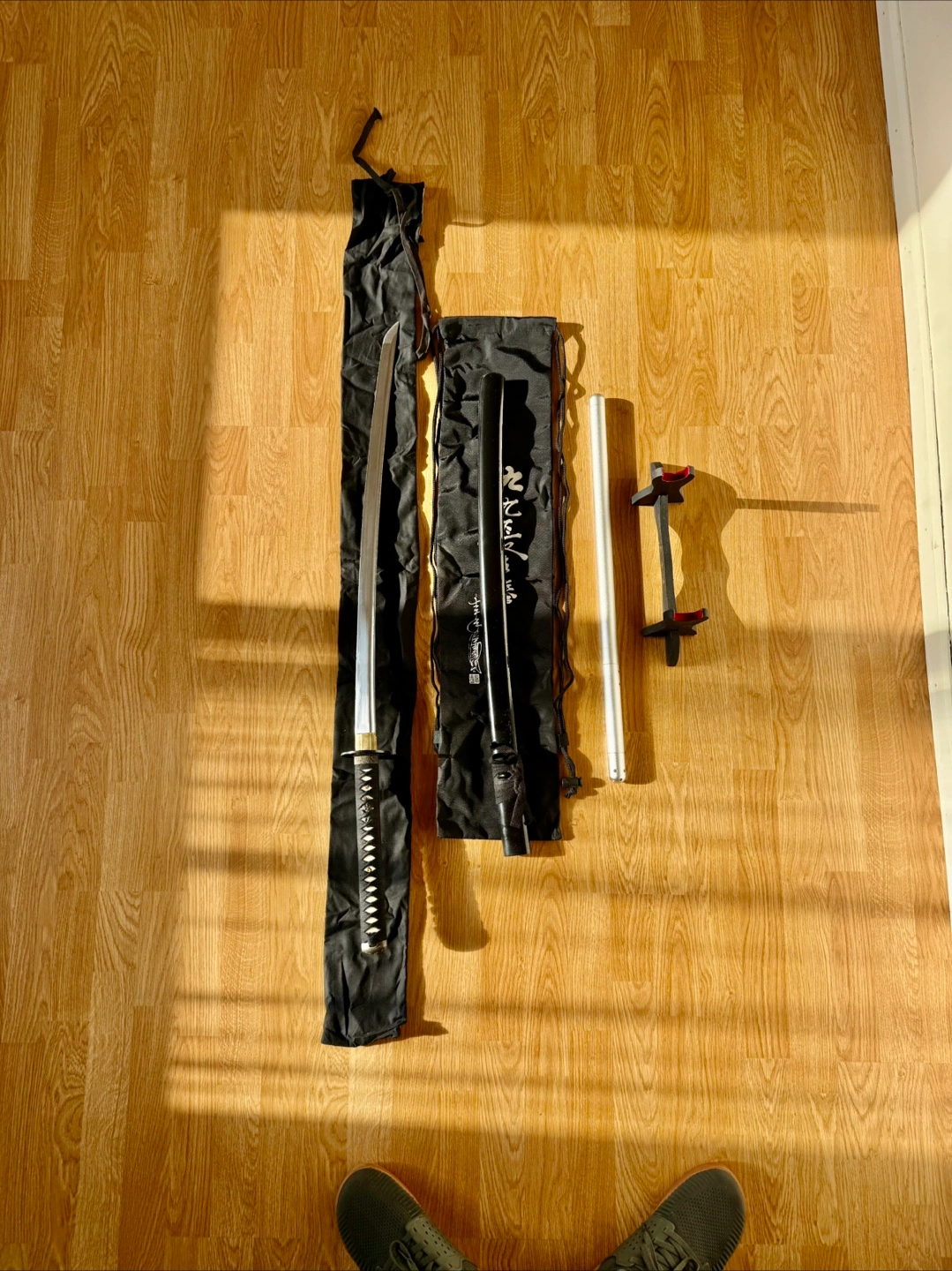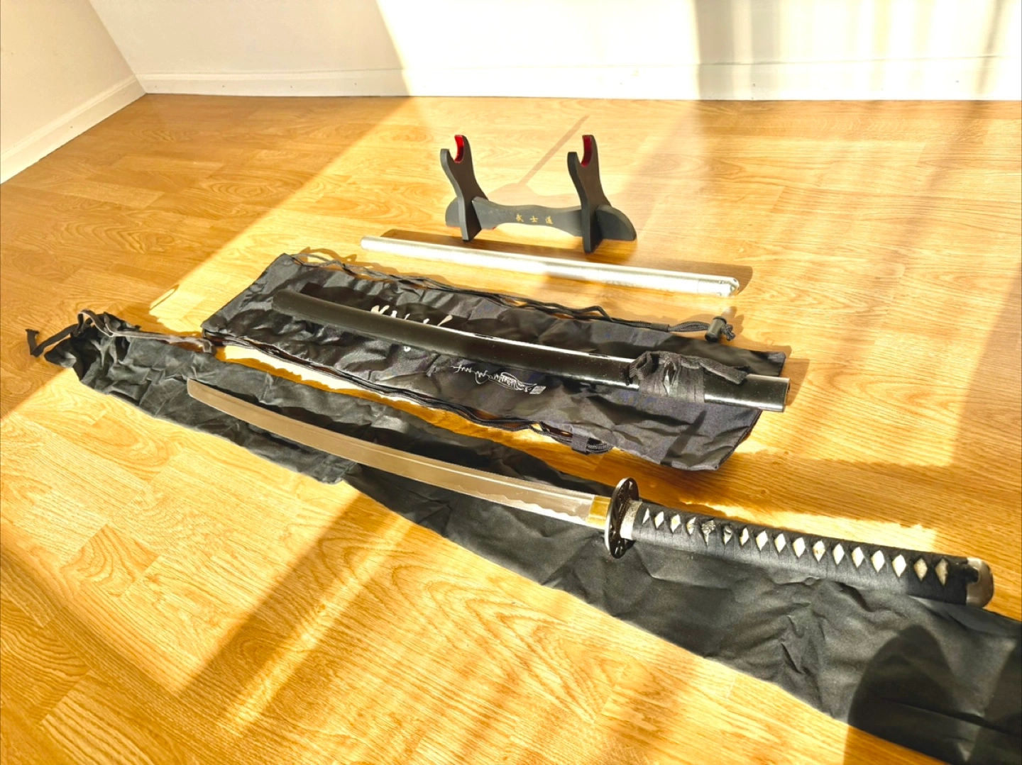 Selling a decorative katana sword complete with a stand and accessories! (Not fully sharpen but still has a sharp edge so be careful!) Perfect for display or practice.