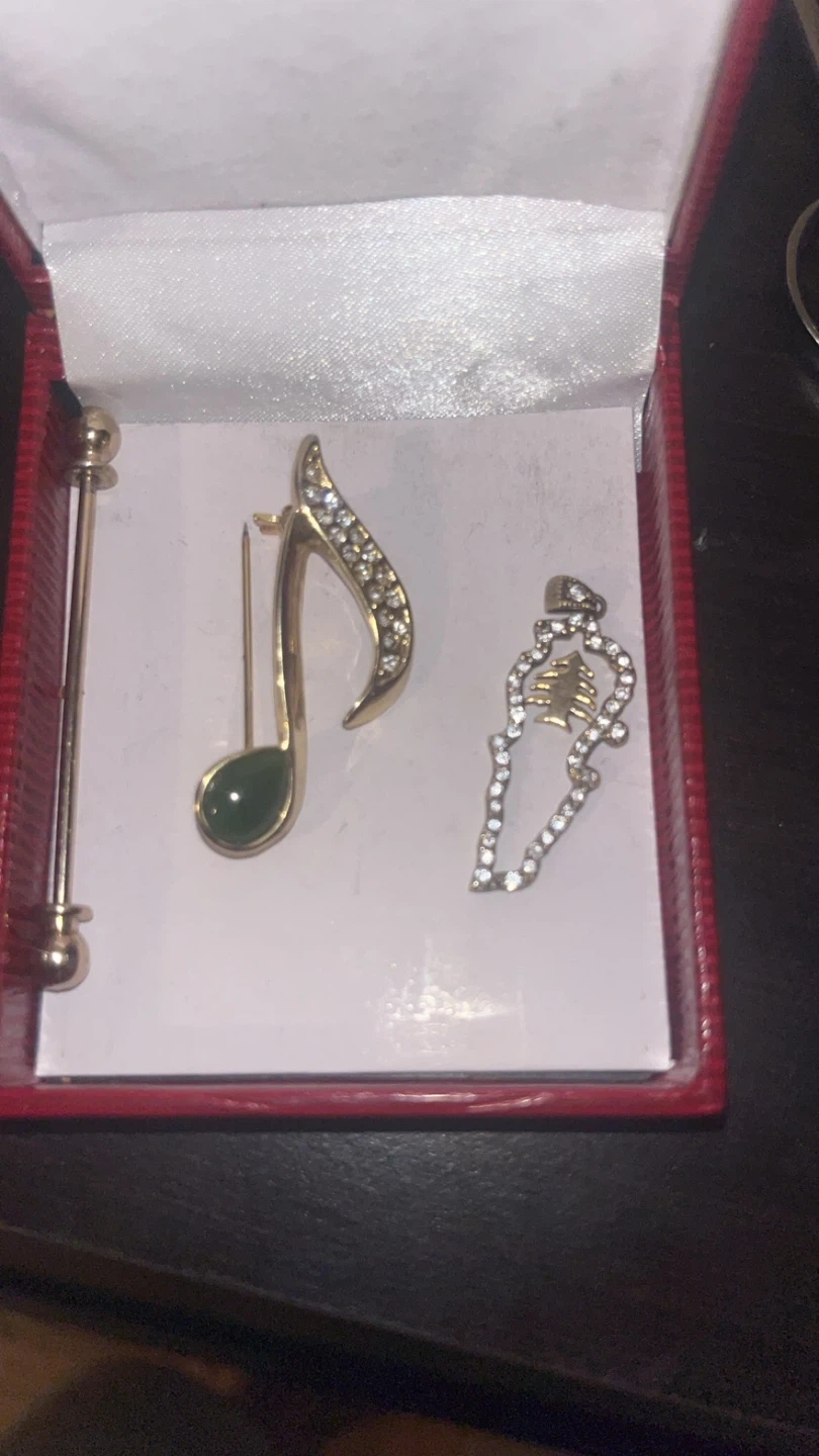 Selling a set of vintage brooches! One brooch is designed as a music note with a green accent, and the other features a tree design with sparkling stones. They come in a box, perfect for gifting or adding to your collection