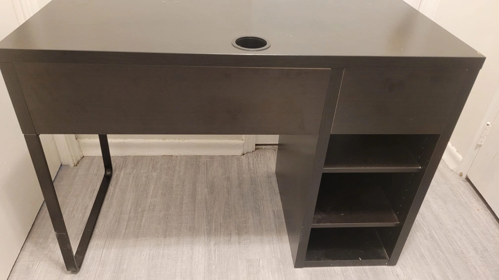 Selling a dark brown computer desk. It has 2 drawer and some shelving on one side. There are few spot on the top surface however great condition. Steady and good