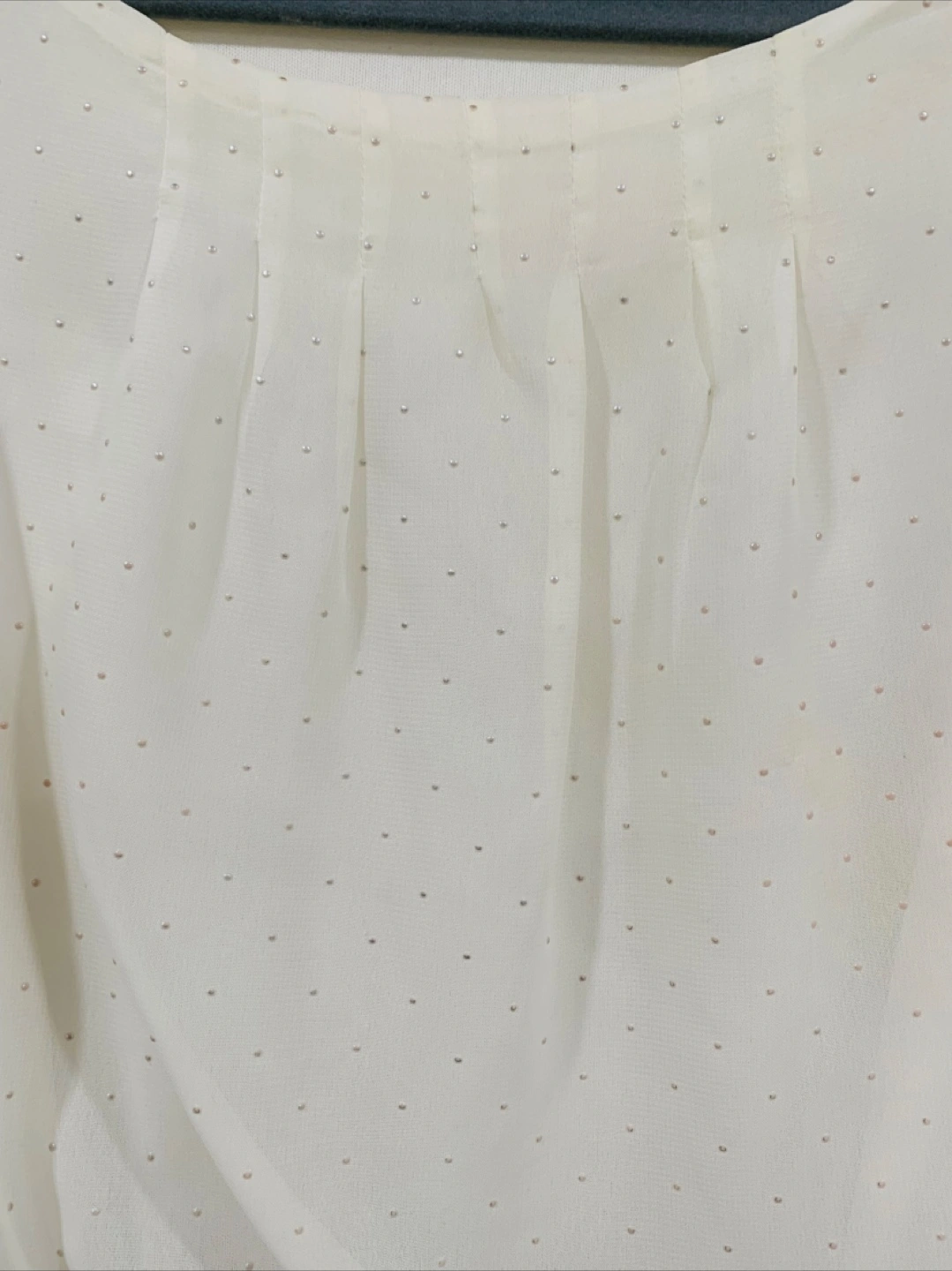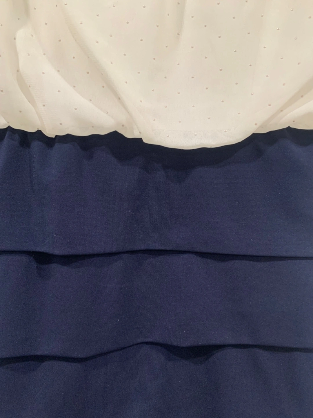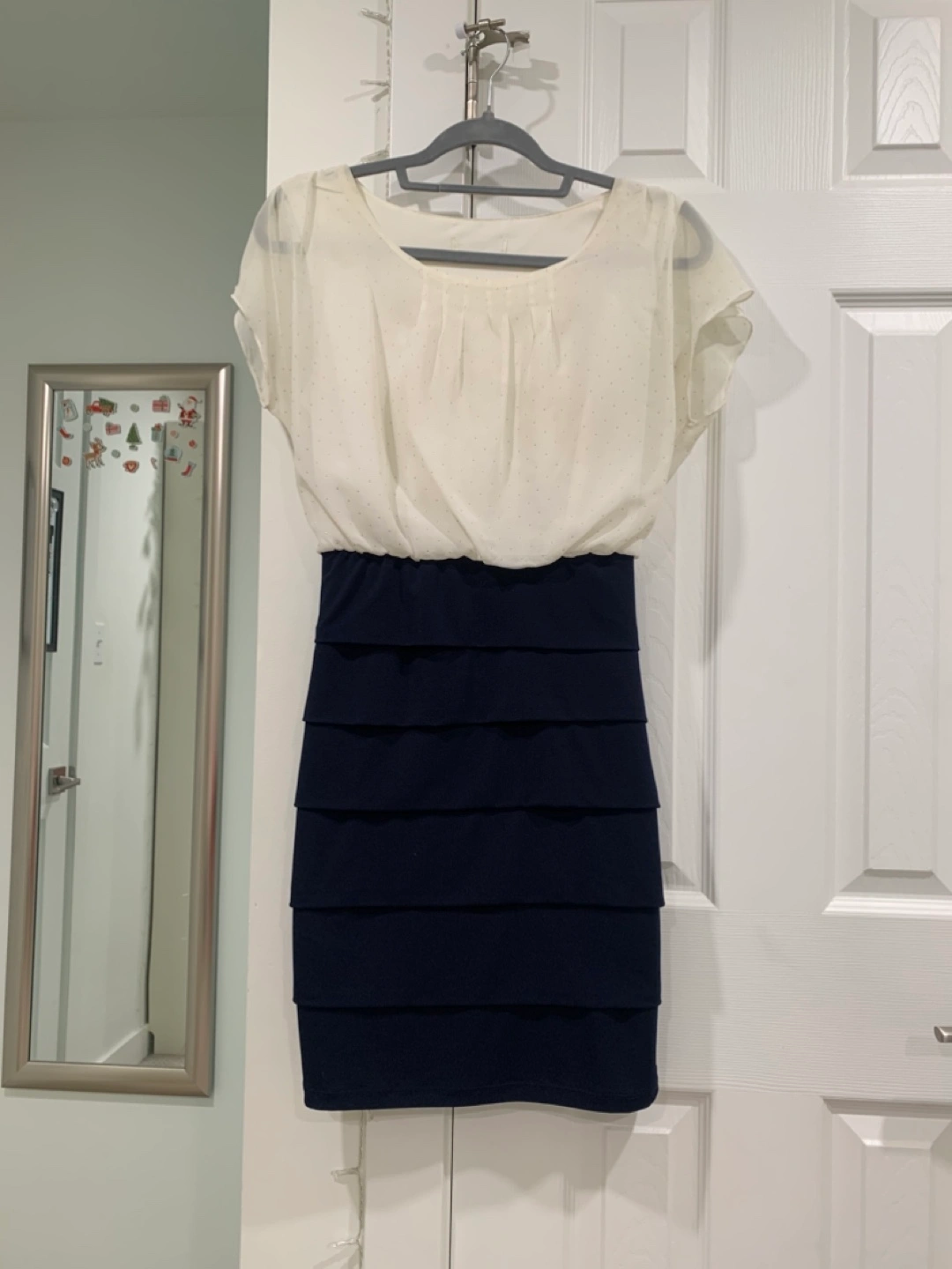 This dress has a white dotted blouse with a navy pencil skirt. It has rarely been used and is in good condition. The top blouse part has little dots, nice cinching around the neckline and flutter cap sleeves. The pencil skirt on the bottom hugs the hips and gives a nice figure. It’s very classy and I find it always makes me feel very respectable and confident. Can be used for work/office attire, fancy events, etc. it is very comfortable and stretchy, would easily fit anyone from size 2-8.