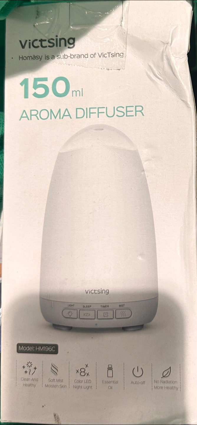 20I'm selling a brand new Victsing 150ml aroma diffuser! It's still in the box and ready to bring some zen to your space. Key features include: - Capacity: 150ml - Low noise level: 21dB - LED lights: 8 Colors - Time setting - Sleep mode Model number: HM196C. It features soft mist for moist skin, colour LED night light, and auto-off function. Box included!