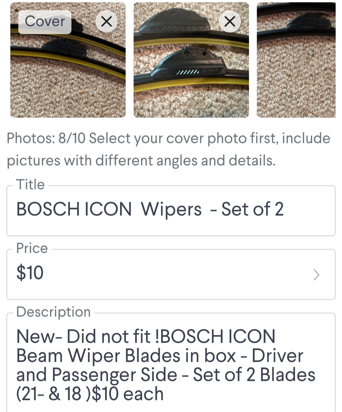 New BOSCH ICON beam wiper blades in the box! This is a set of 2 blades for the driver and passenger side (21- & 18). They didn't fit my car, so I'm hoping they'll fit yours