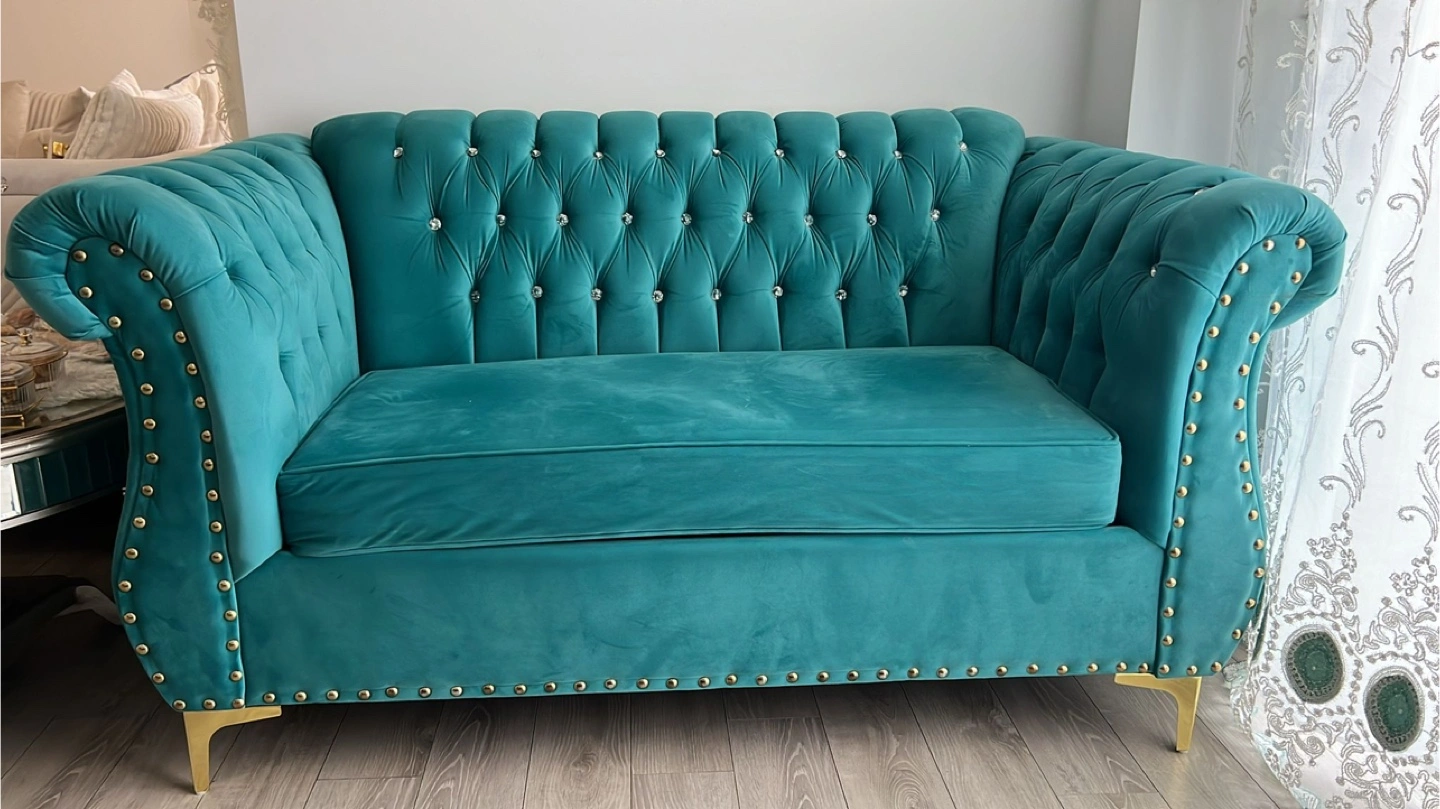 Selling a beautiful teal velvet loveseat sofa! It has a tufted design with gold accents. The sofa is in great condition and would be a lovely addition to any living space