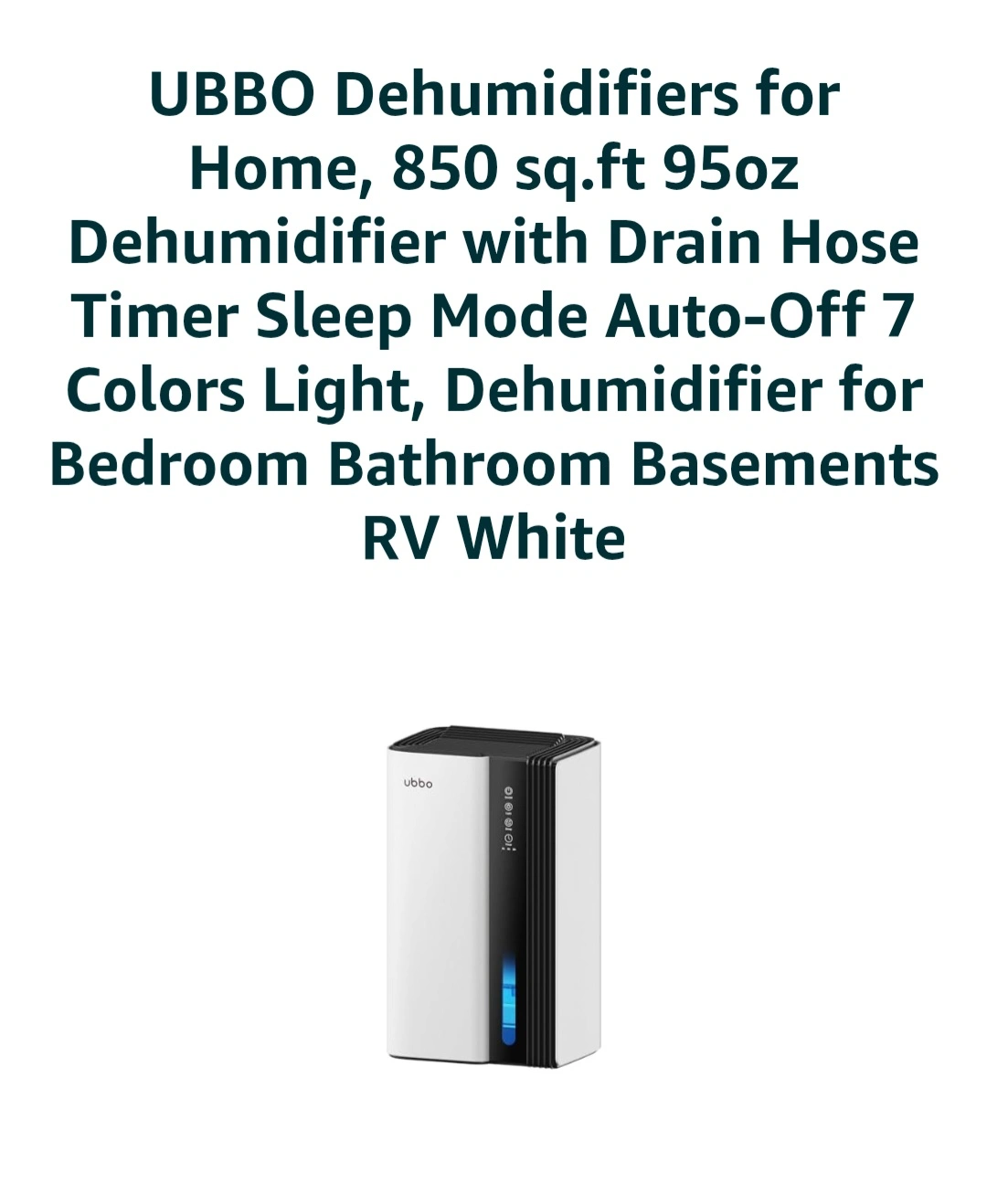 44This is an UBBO Dehumidifier for Home, perfect for spaces up to 850 sq.ft. It features a 95oz capacity and includes a drain hose. It also has a timer, sleep mode, auto-off function, and 7 colour lights. Ideal for bedrooms, bathrooms, basements, or RVs!