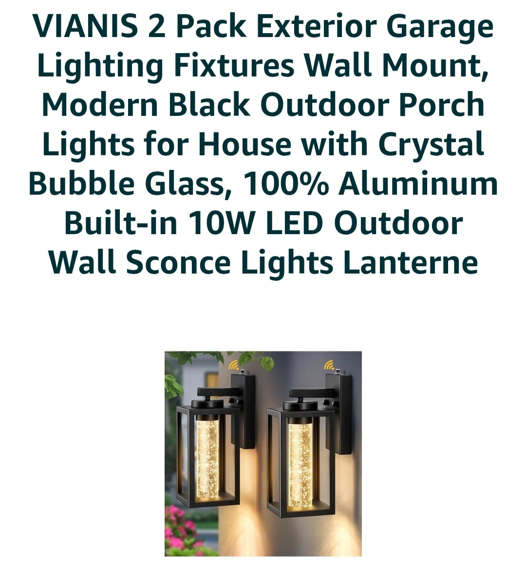 44Selling a set of two VIANIS exterior garage lighting fixtures! These wall-mounted, modern black outdoor porch lights are perfect for adding a touch of elegance to your home. They feature crystal bubble glass and are made of 100% aluminum with a built-in 10W LED. They're designed as wall sconce lights lanterne