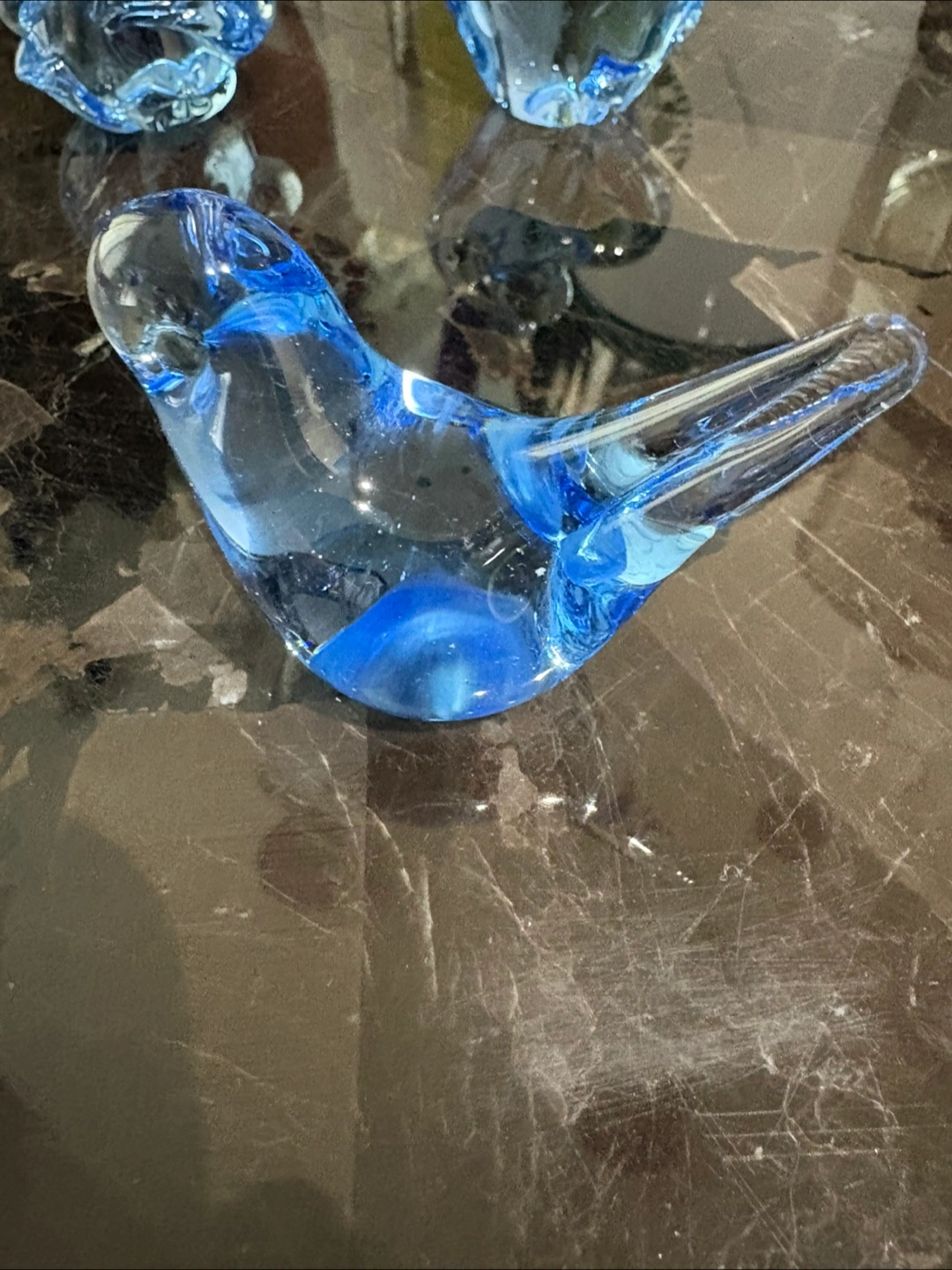 Selling a set of beautiful blue glass figurines! The set includes a bird, an elephant, and a Mickey Mouse figurine. They're in great condition and would look lovely on a shelf or desk. EUC