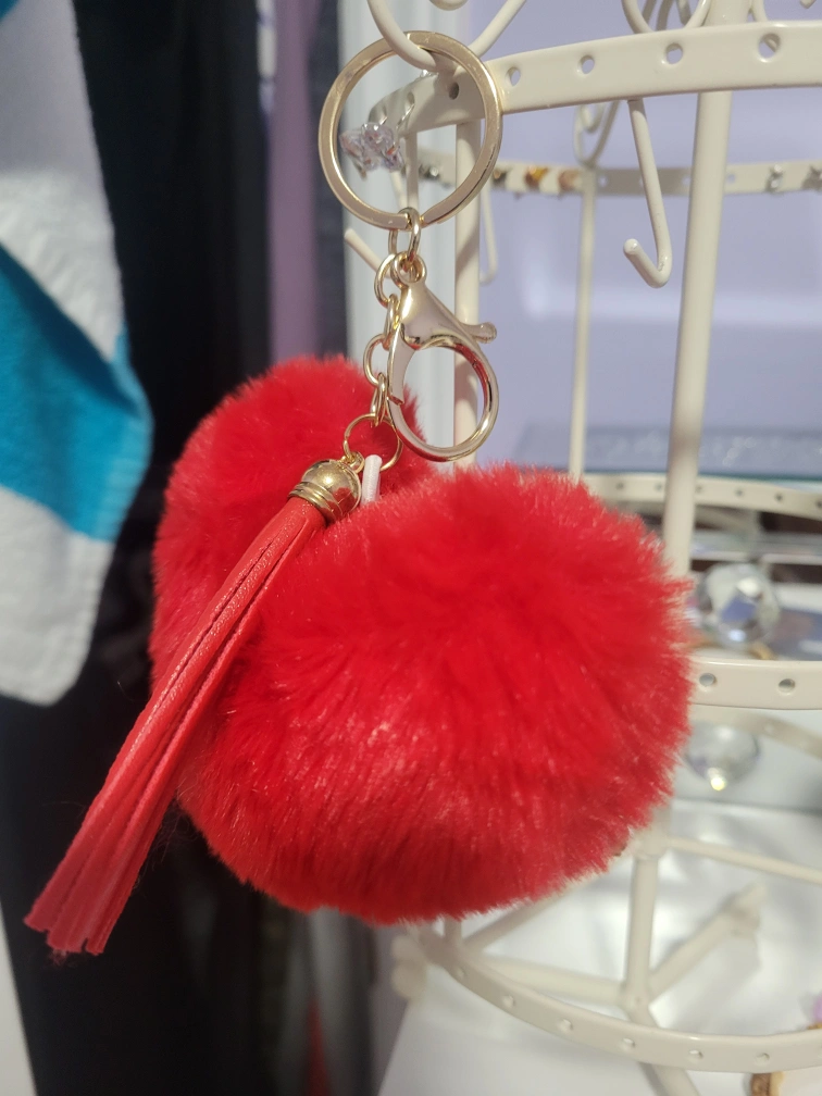 Here's a cute red heart-shaped keychain! It's fluffy and has a matching red tassel. Perfect for adding a pop of colour to your keys or bag. If you have any other inquiries please do not hesitate to message.