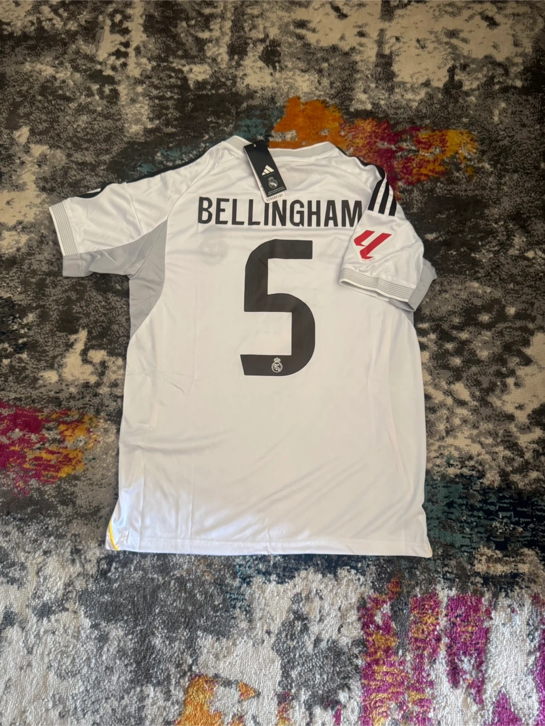Selling an Adidas Real Madrid jersey with Bellingham #5 on the back. It's white with black stripes on the shoulders and the Emirates Fly Better logo on the front. The jersey also features the Real Madrid club crest. It's in great condition!