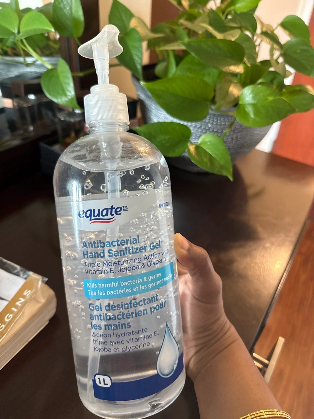 Selling a 1L bottle of Equate Antibacterial Hand Sanitizer Gel. It has a triple moisturizing action with Vitamin E, Jojoba, and Glycerin. Helps to kill harmful bacteria and germs, keeping your hands clean and moisturized!