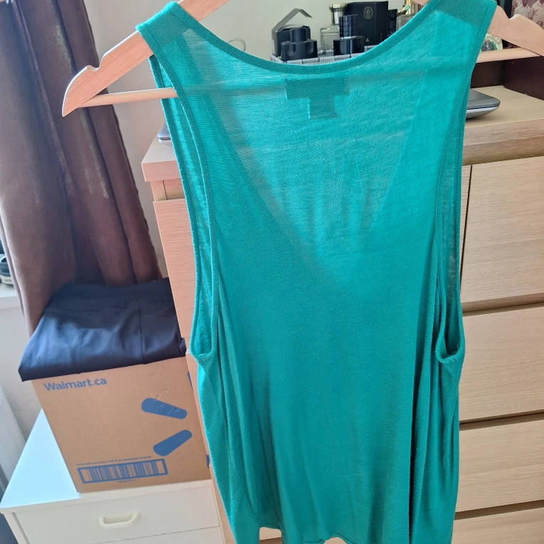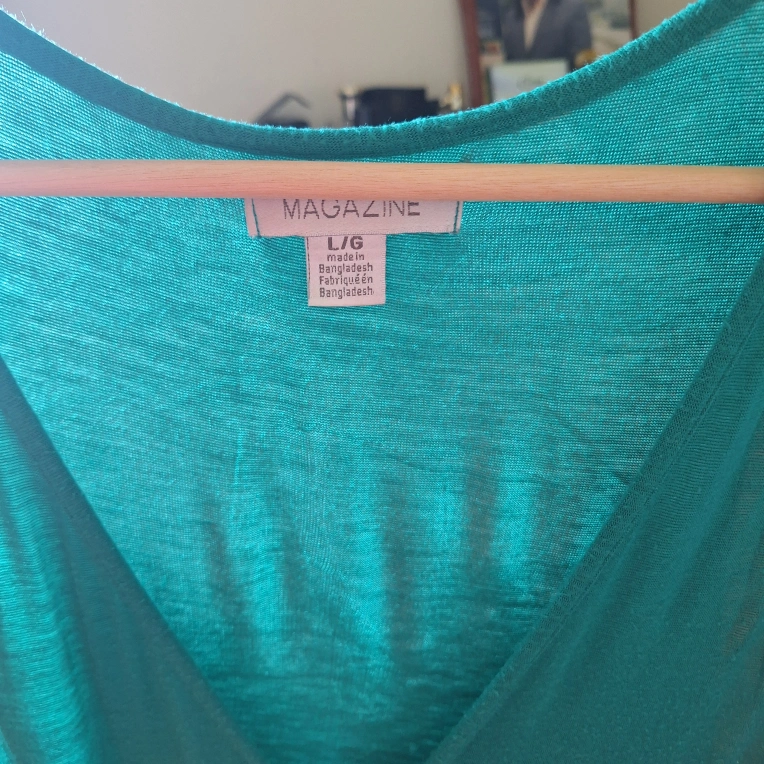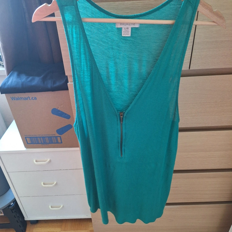 527Selling a stylish Magazine tank top in a vibrant green colour. It's a size L/G and features a unique design with a zipper detail. Perfect for a casual and trendy look!