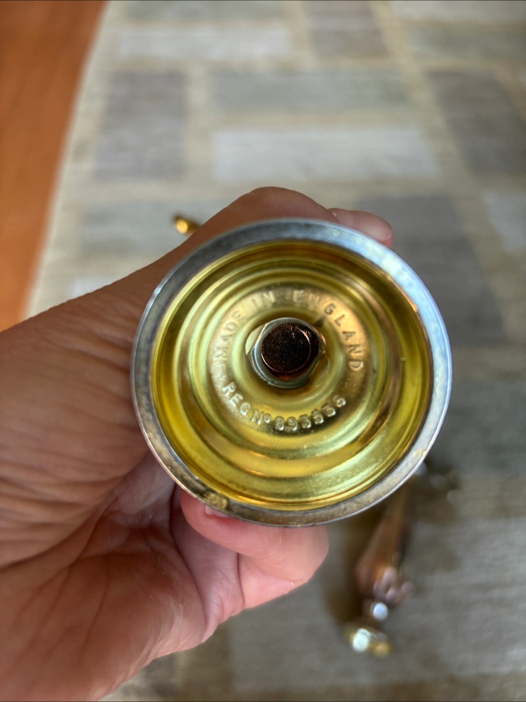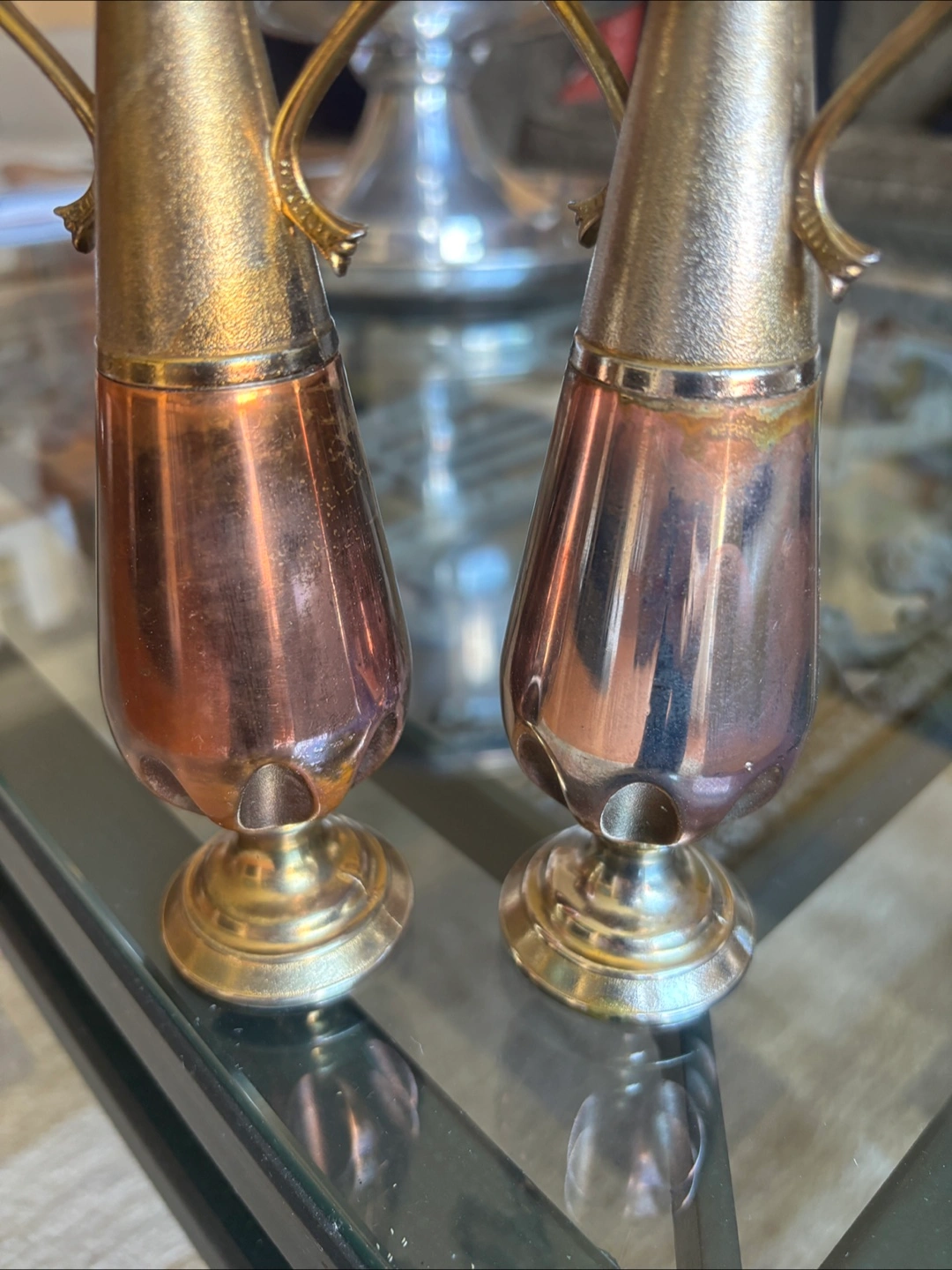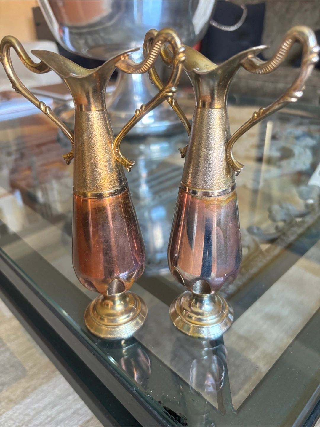 Selling a pair of vintage brass and copper bud vases, marked "Made in England" on the base. They have a unique design with handles and a mix of copper and gold tones. Perfect for adding a touch of vintage charm to your home!