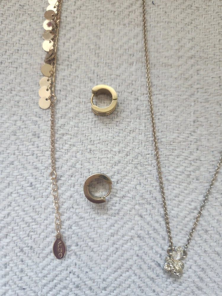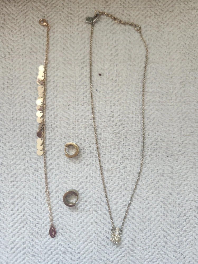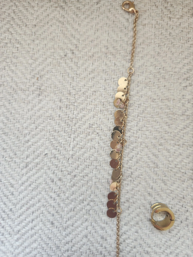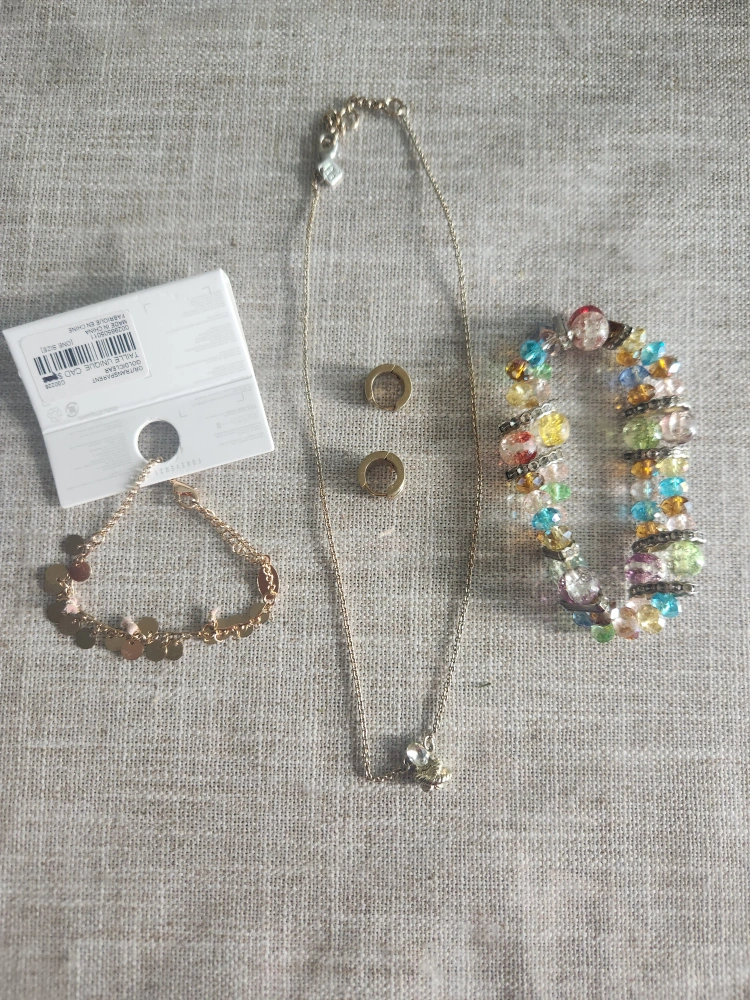 189Selling a cute jewelry set! It includes a new gold-tone bracelet with coin charms and a used delicate necklace. pair of earrings. Perfect for adding a touch of sparkle to any outfit