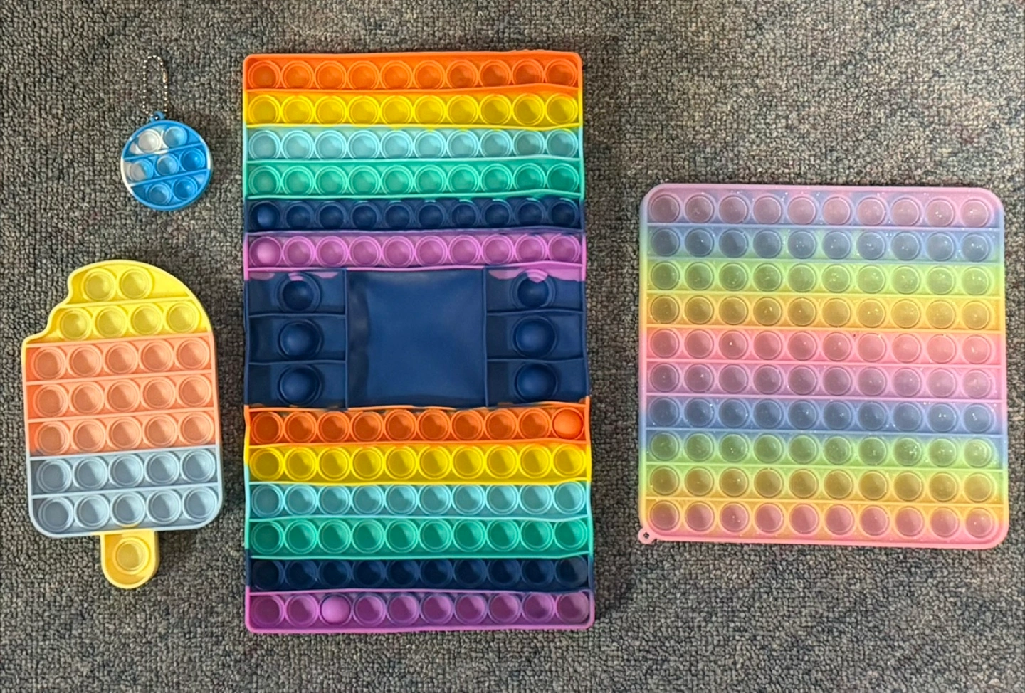Selling a set of four fun rainbow-coloured Pop It fidget toys! Great for stress relief and sensory play, this lot includes a rectangular one, a square one, an ice cream-shaped one with the alphabet, and a small round keychain one. $10