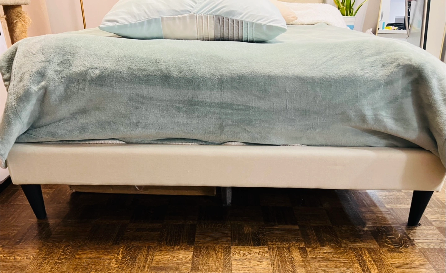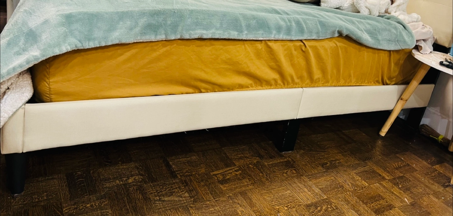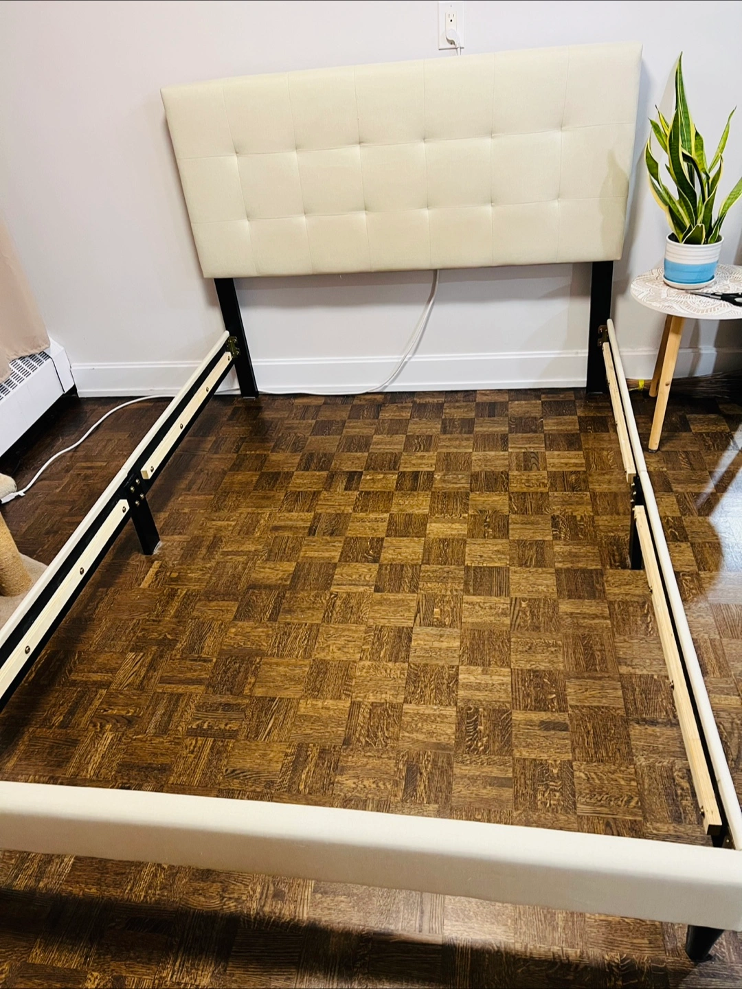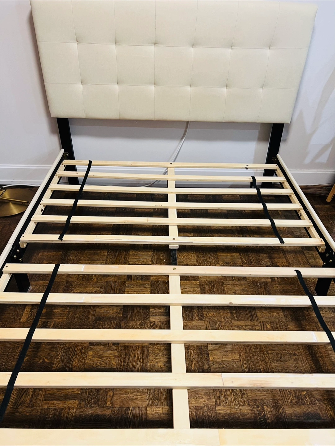 Selling a wooden bed frame with beige upholstered headboard with all the screws and a FREE hex key for easy installation.