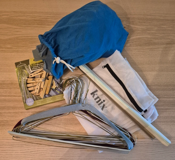 Bundle includes clothes pins, wire hangers, cardboard covers to hang pants, foam hanger covers, and mesh bags for washing delicate items.