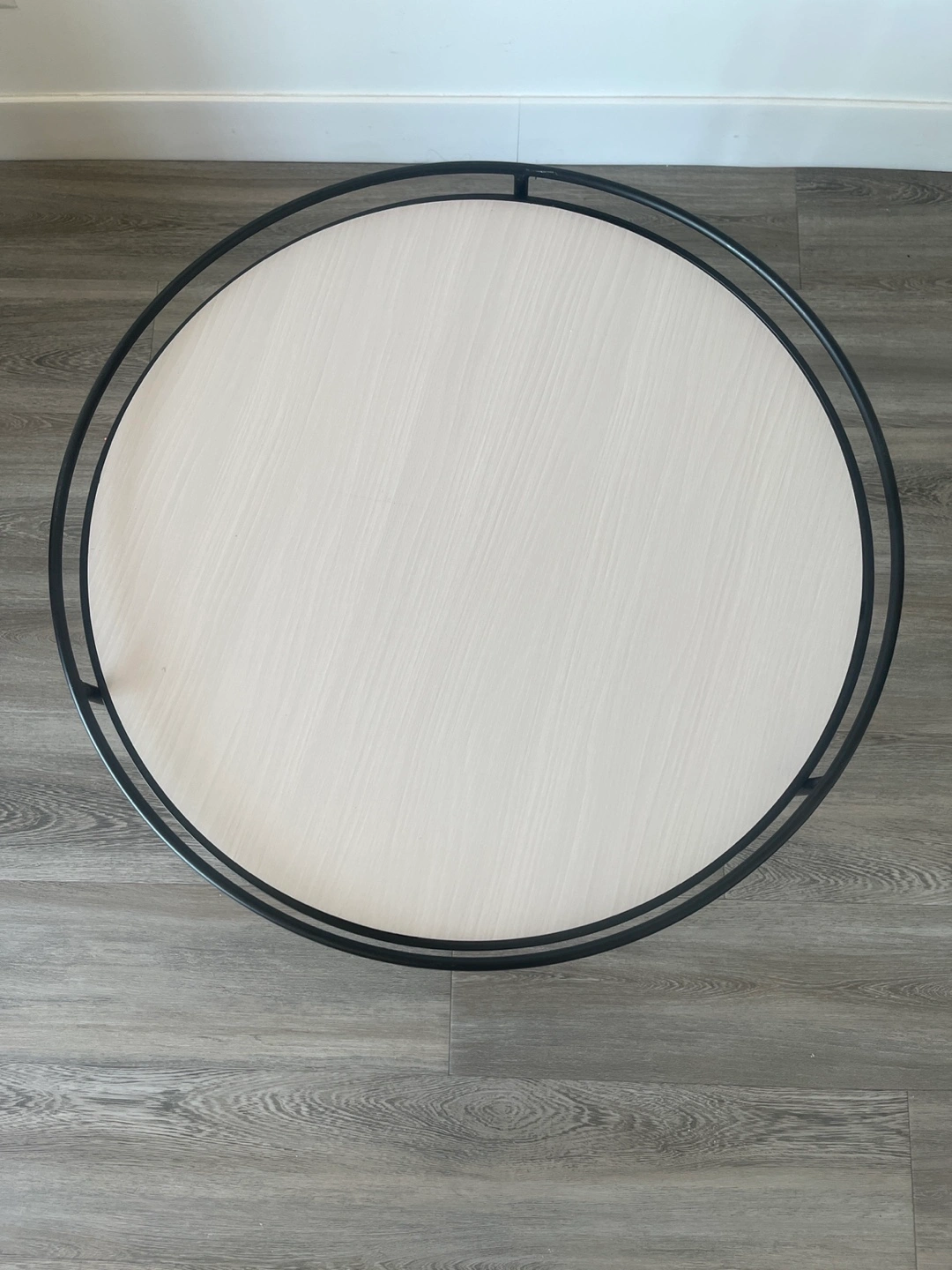 Selling a stylish round coffee table with a sleek black metal frame. It's in great condition and would be a lovely addition to any living room. The tabletop has a light-coloured wood grain finish that complements the black frame nicely.