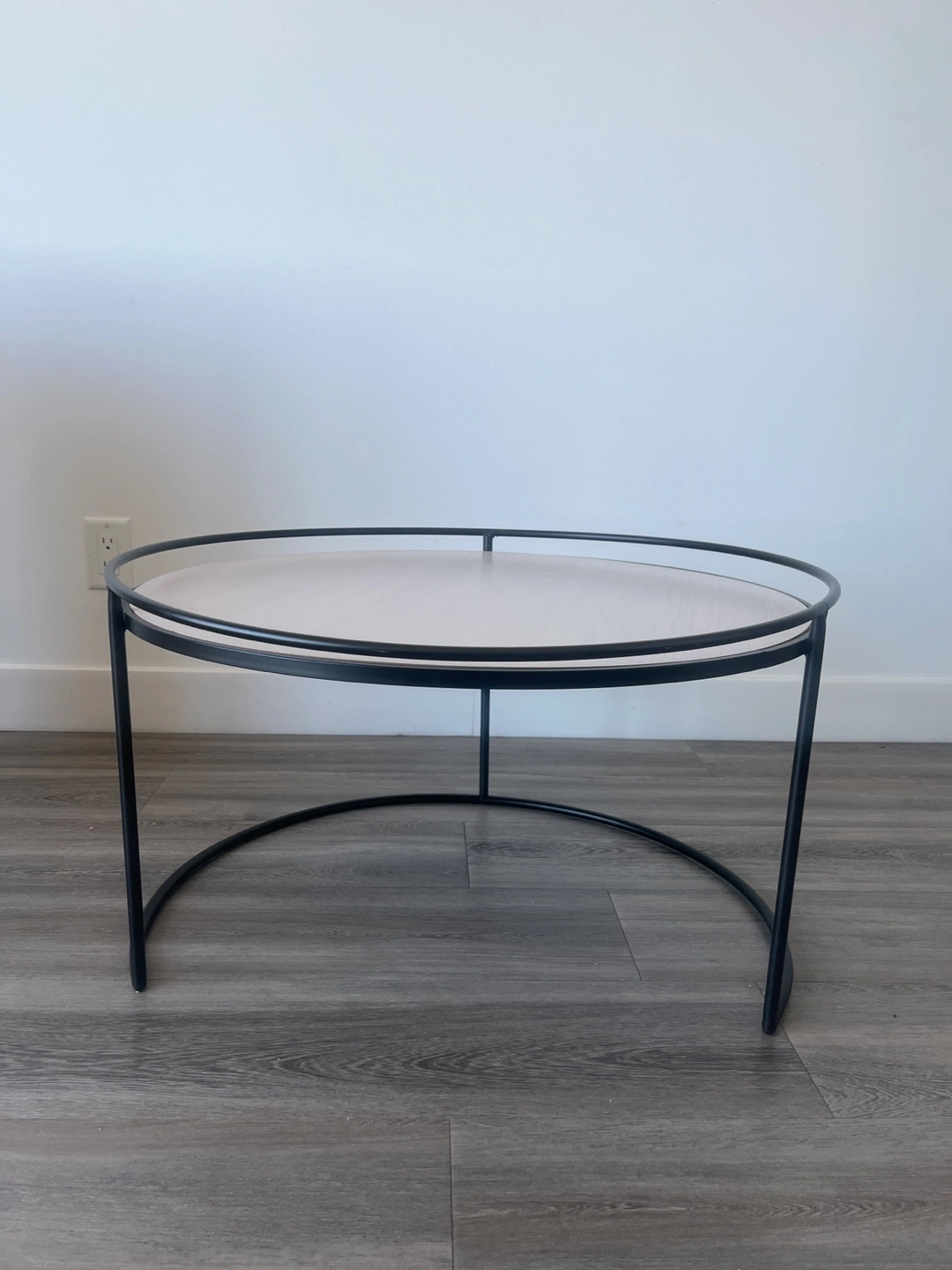 Selling a stylish round coffee table with a sleek black metal frame. It's in great condition and would be a lovely addition to any living room. The tabletop has a light-coloured wood grain finish that complements the black frame nicely.