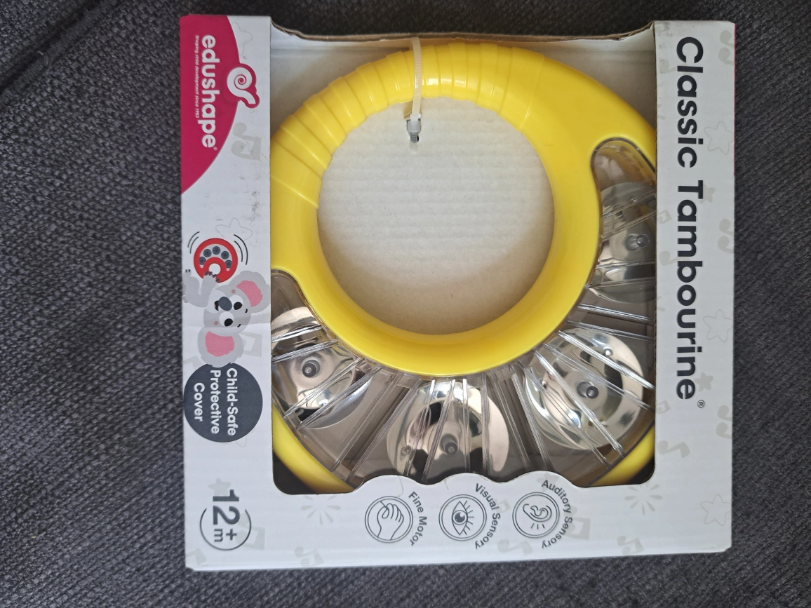 I'm selling a brand new Edushape Classic Tambourine, still in its original packaging! This tambourine is designed with bright colours and quality materials, making it a safe and fun instrument for your little one. It's suitable for ages 12 months and up and helps with visual, auditory, and sensory development. The tambourine is sturdy and safe, so you can feel good about your child playing with it