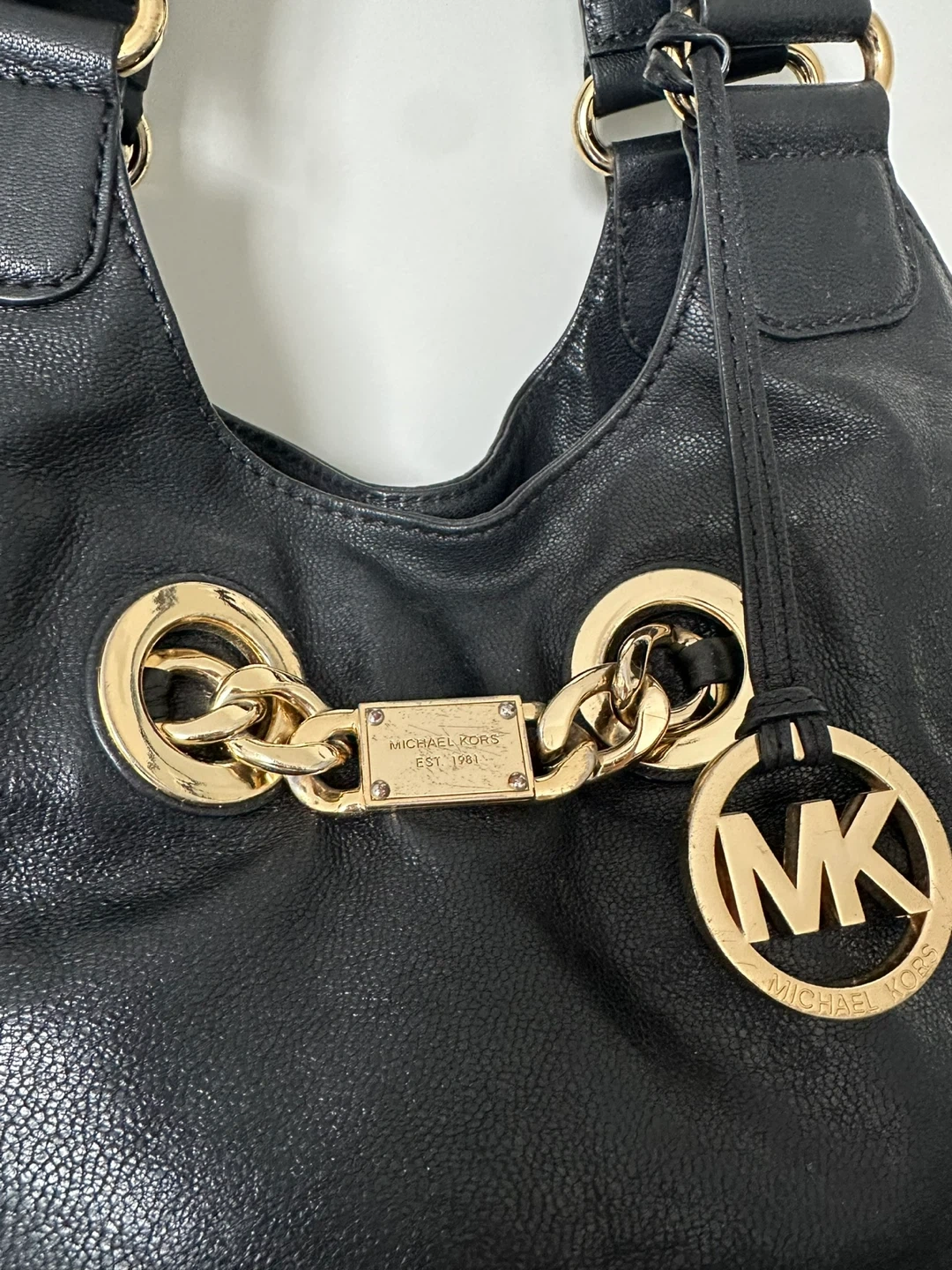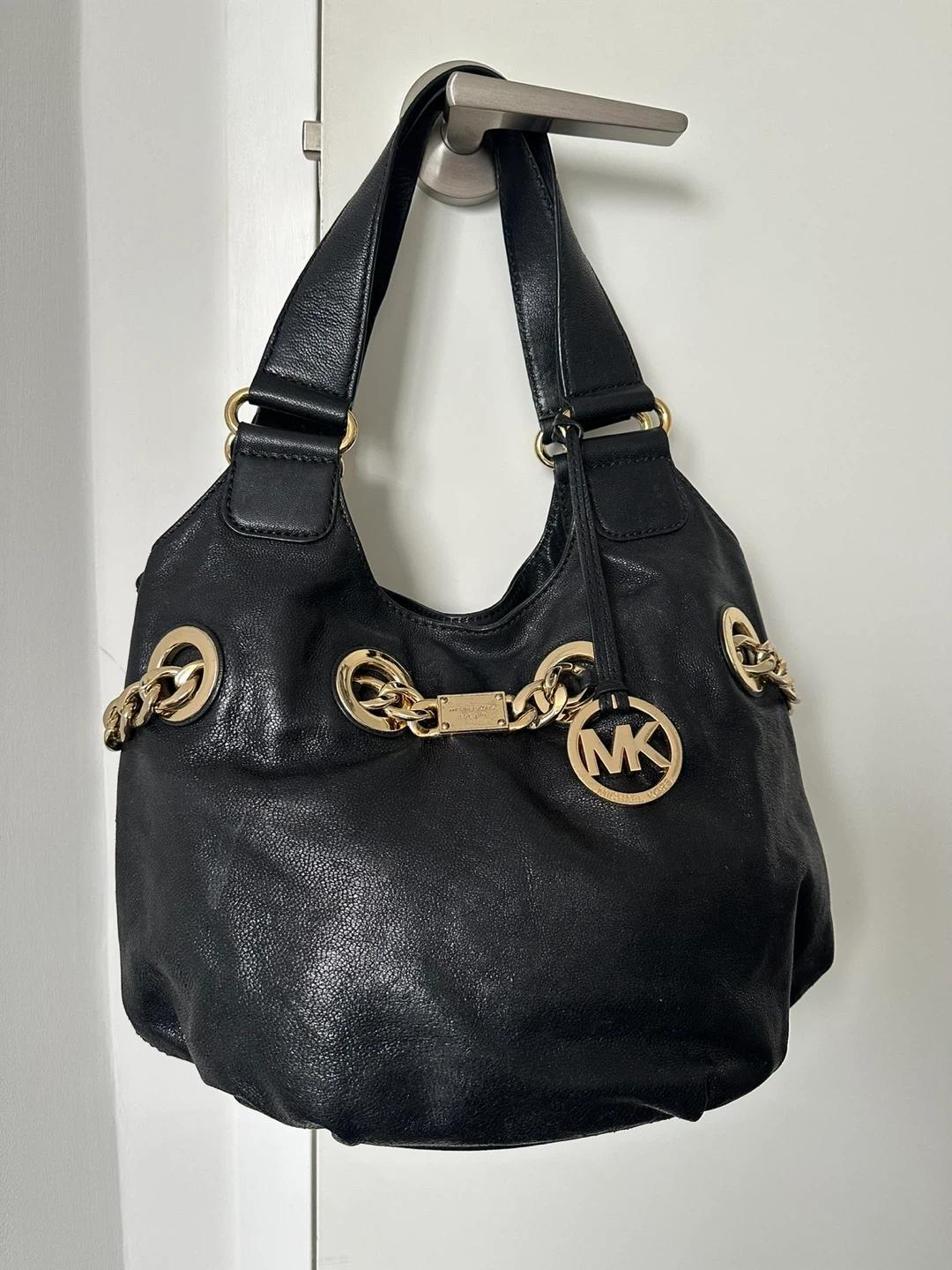 This is a stylish Michael Kors shoulder bag in black leather. It features gold-tone chain detailing and the iconic MK logo. It's in great condition and ready for a new home!