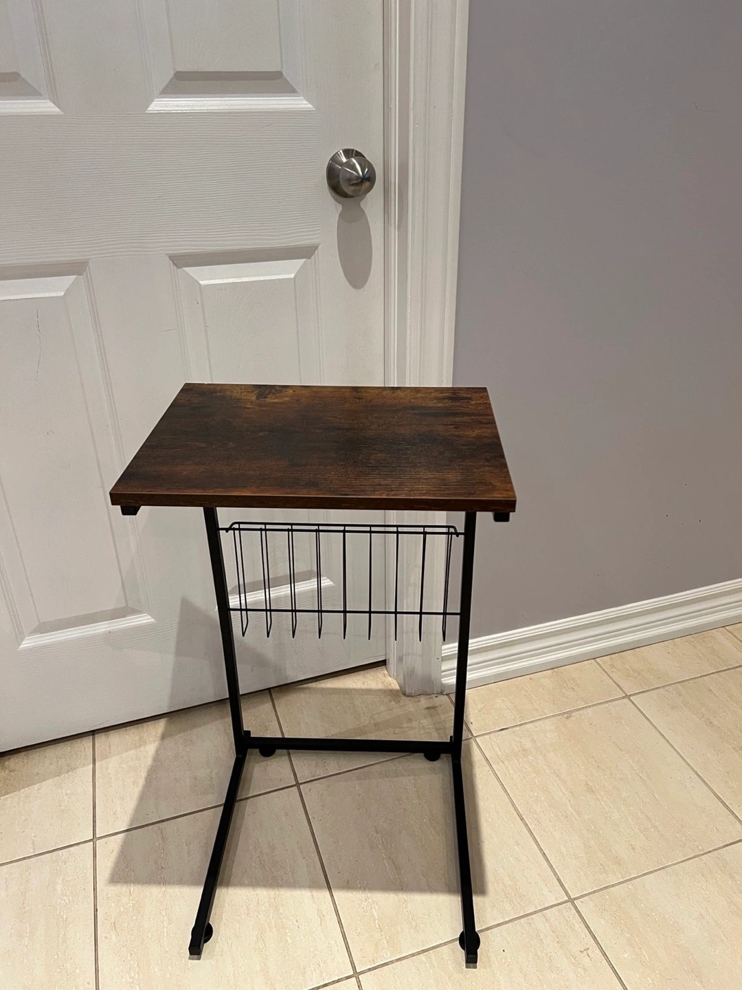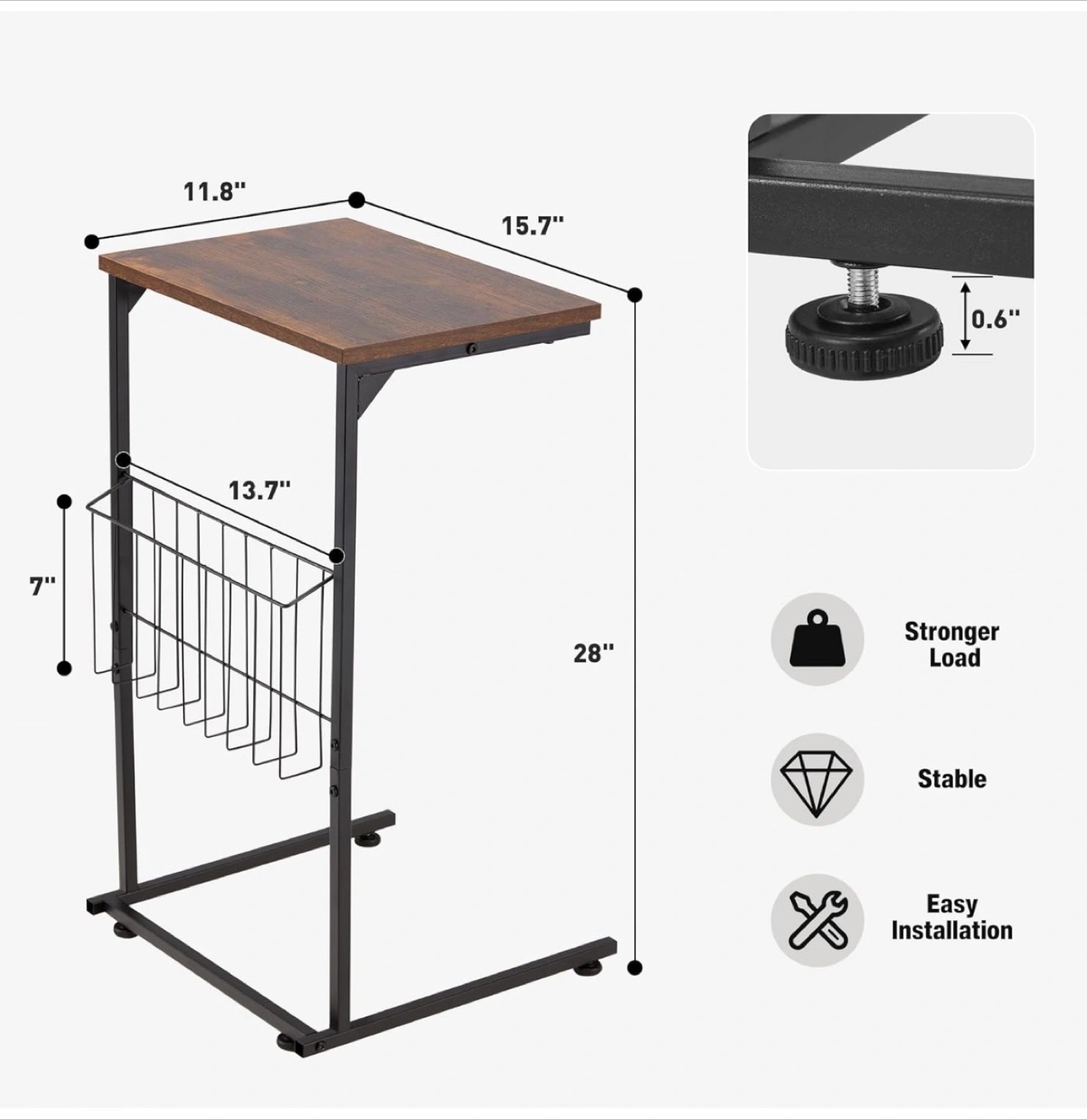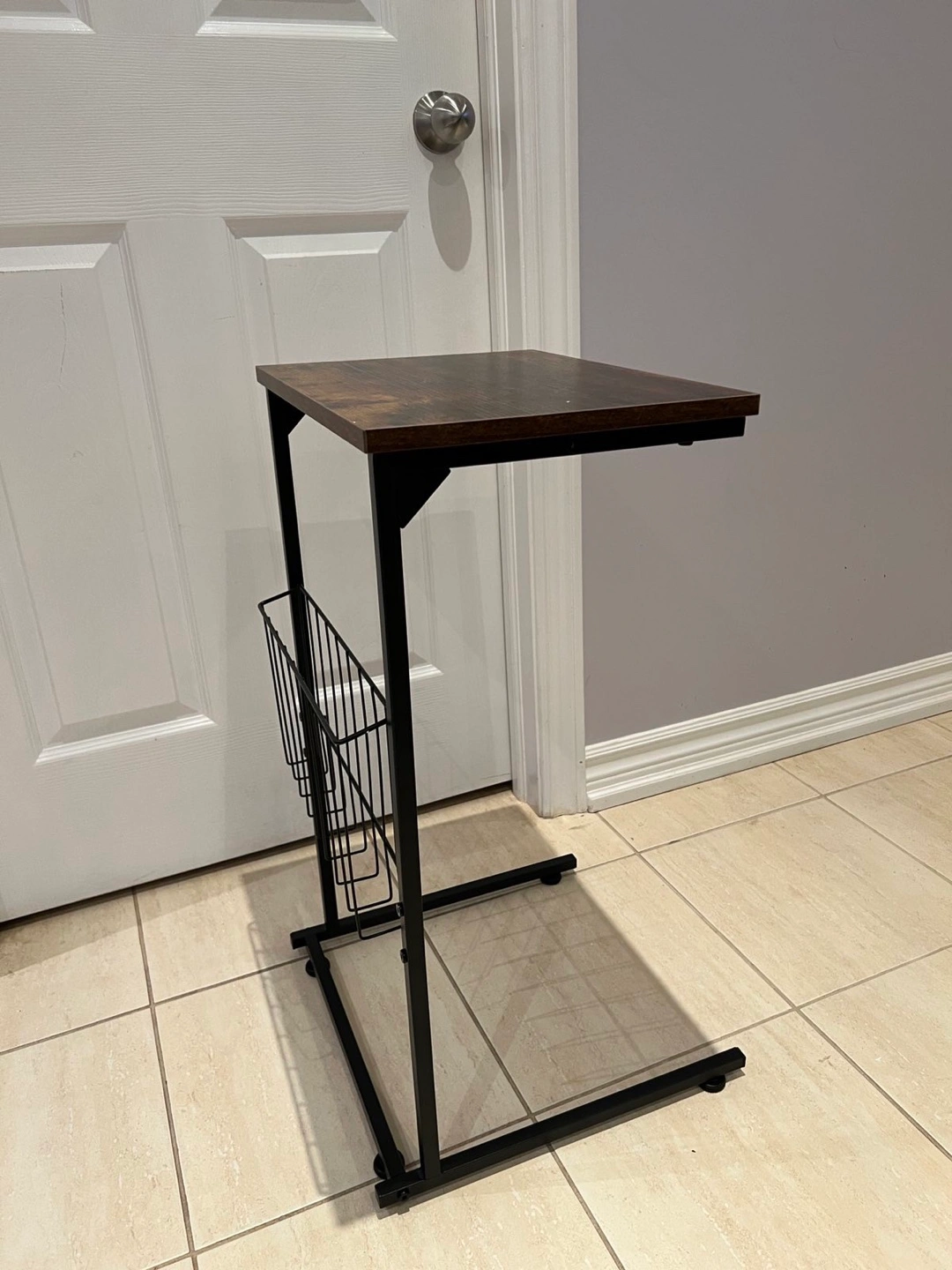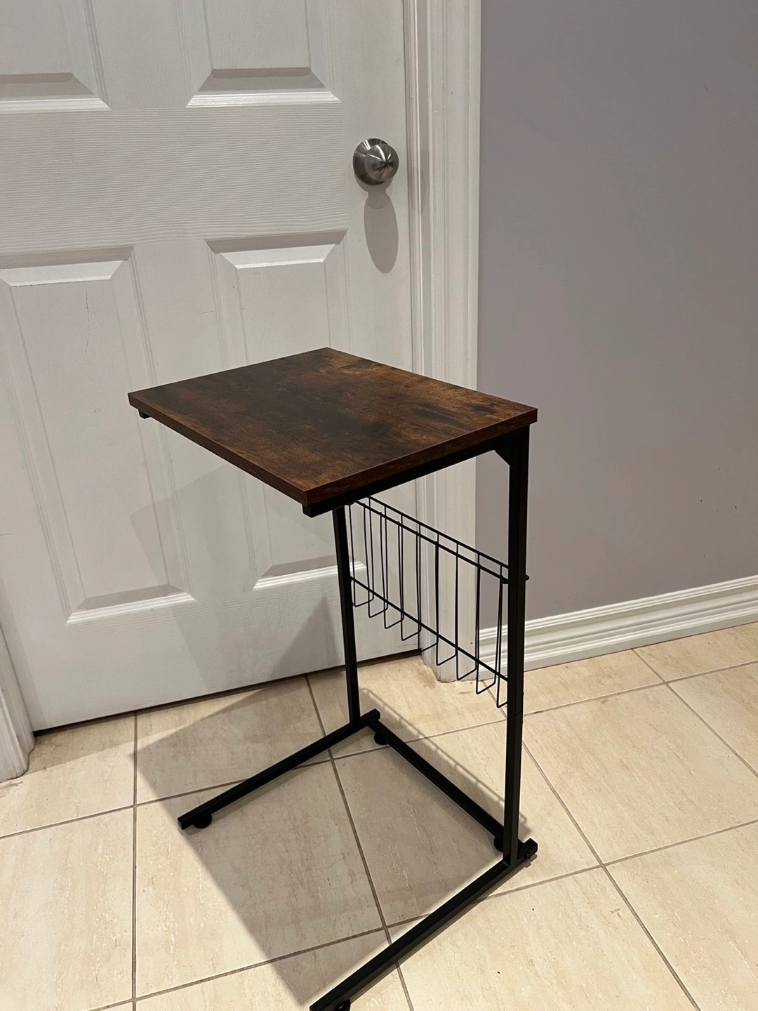181Looking to add a little something to your living room? This C-shaped side table could be just what you need! It's a stylish brown and black colour, and the table is about 27 inches tall. It also has a handy magazine rack on the side, perfect for keeping your reading materials organized