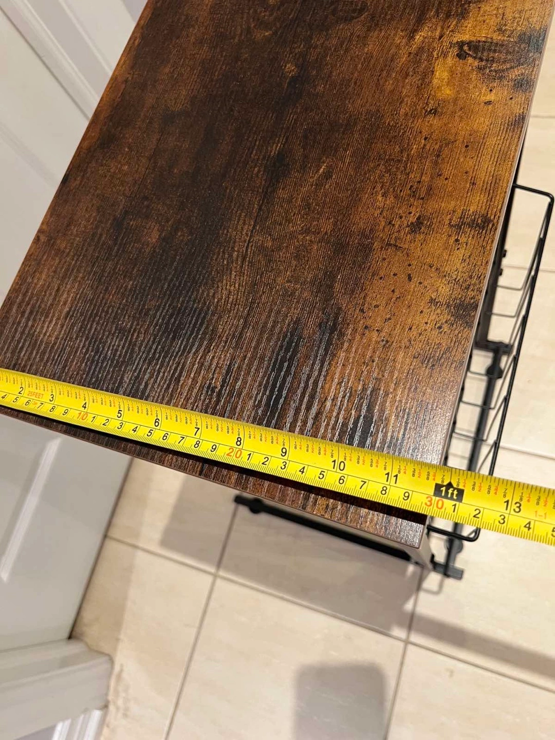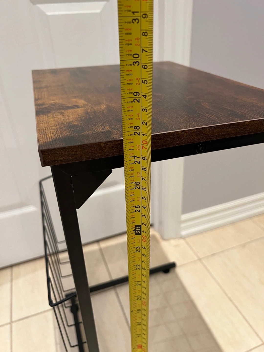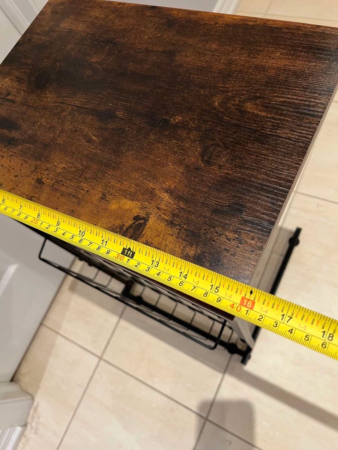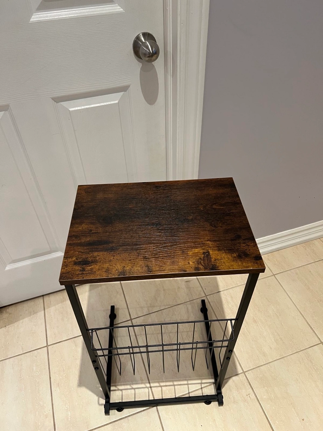 181Looking to add a little something to your living room? This C-shaped side table could be just what you need! It's a stylish brown and black colour, and the table is about 27 inches tall. It also has a handy magazine rack on the side, perfect for keeping your reading materials organized
