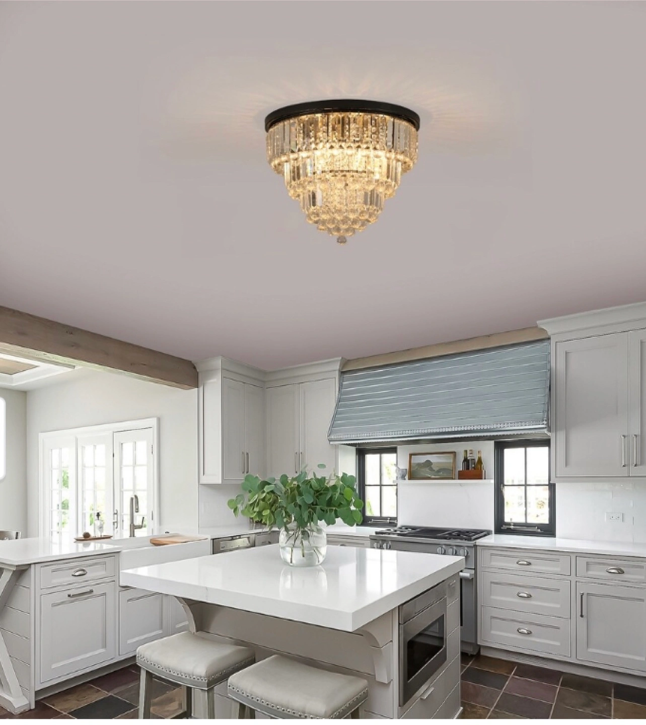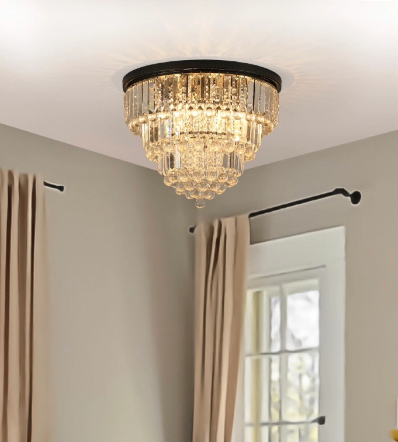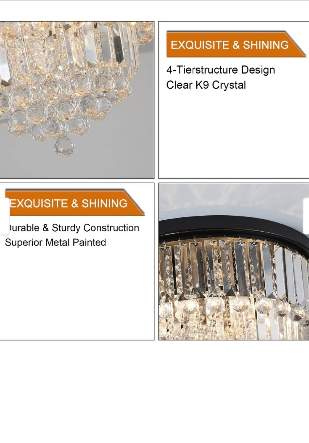 Add a touch of elegance to your home with this stunning crystal chandelier! It features a beautiful 4-tier structure design made with clear K9 crystal and a durable metal frame painted in a superior finish. This exquisite and shining chandelier will definitely brighten up any room!