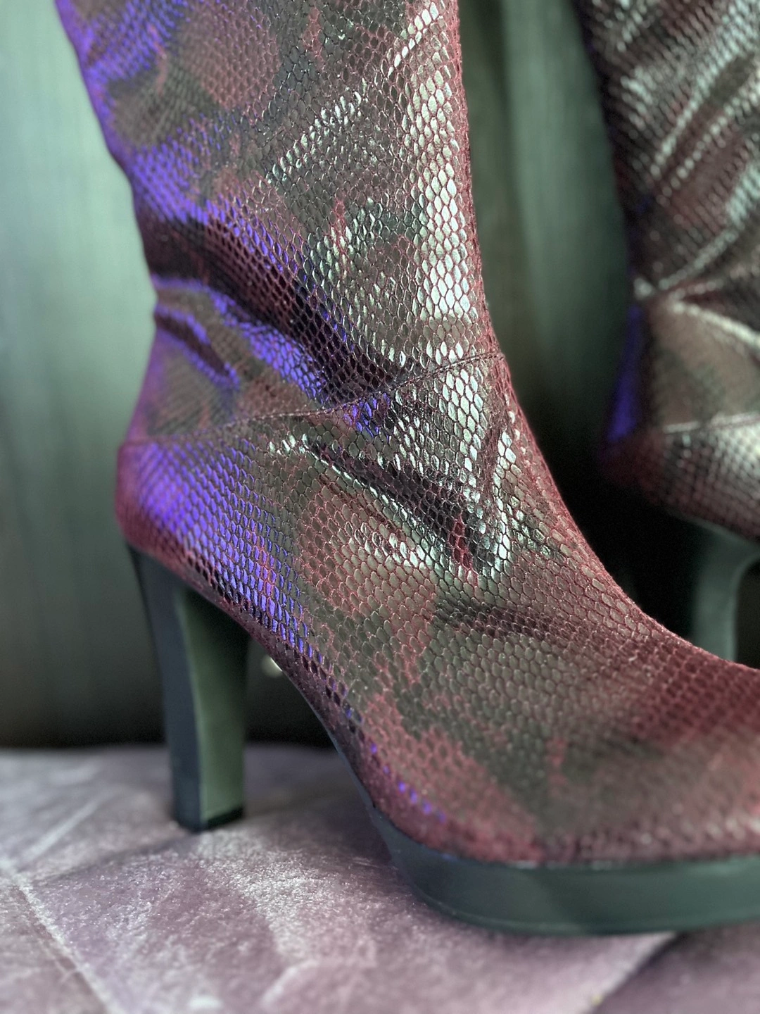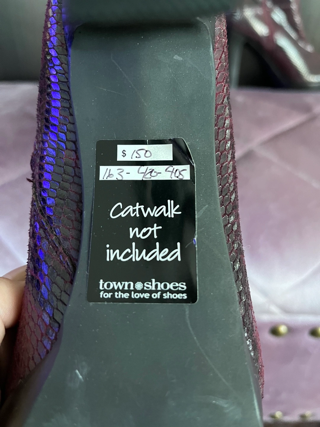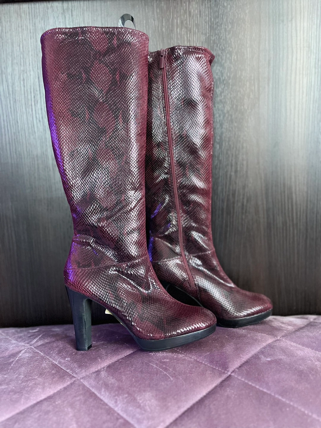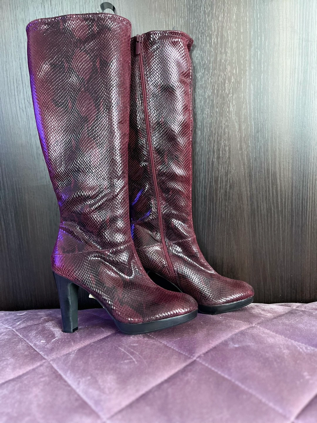 Bought from Town Shoes, never been worn, almond toe shape, shiny imitation snake skin in wine red/black