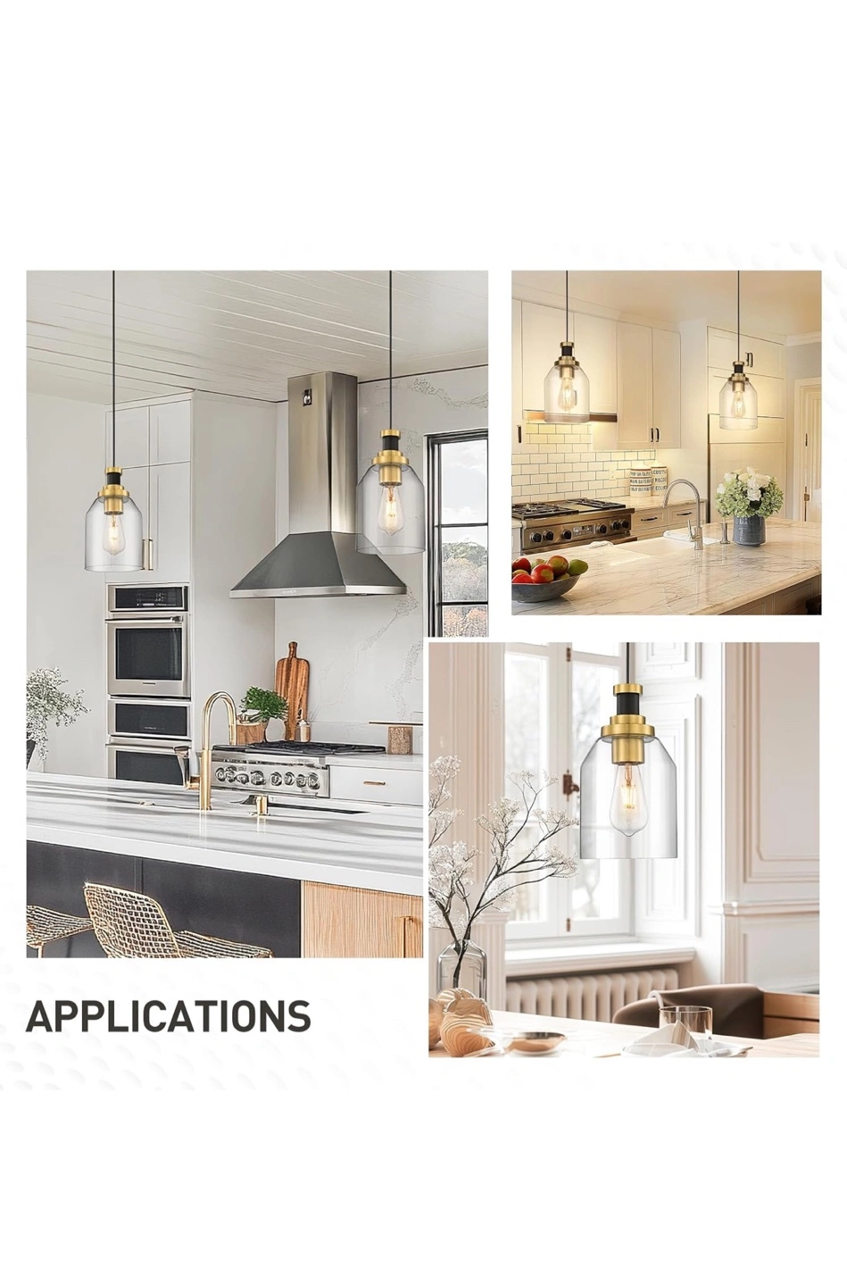 Selling a set of two Zeyu glass pendant lights in black and gold. These modern hanging lights are perfect for a kitchen island or dining room.