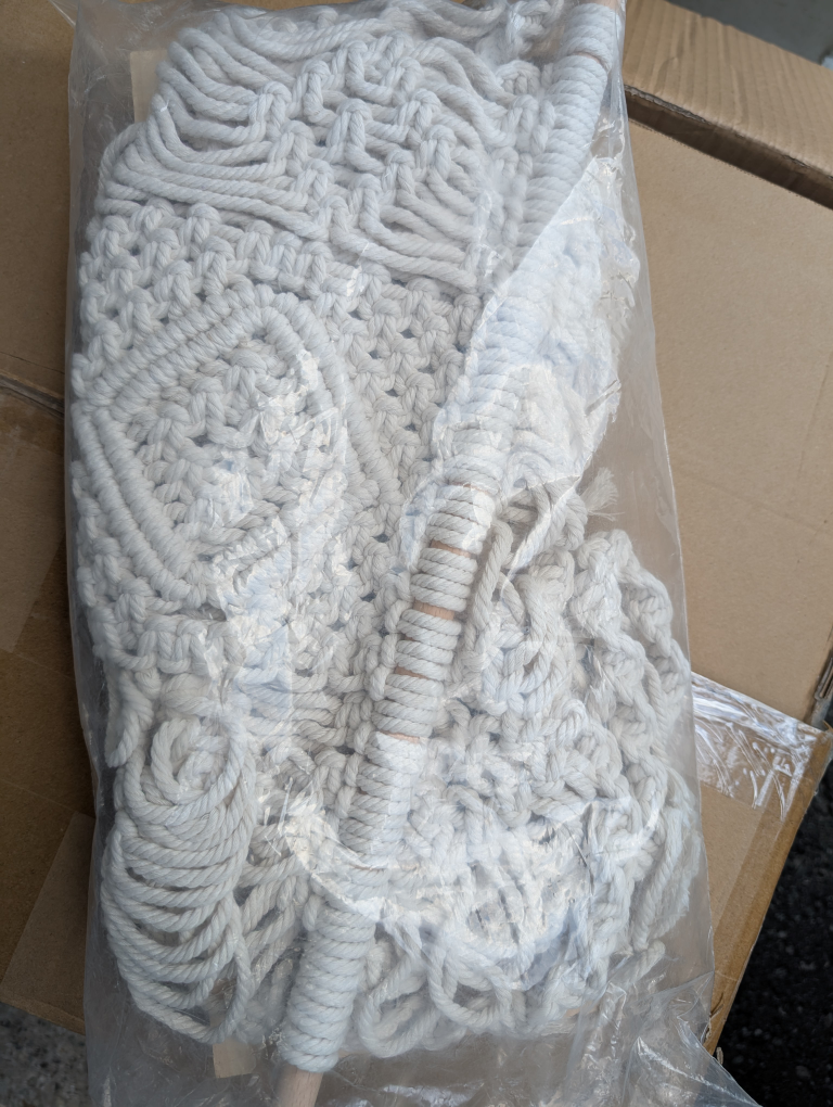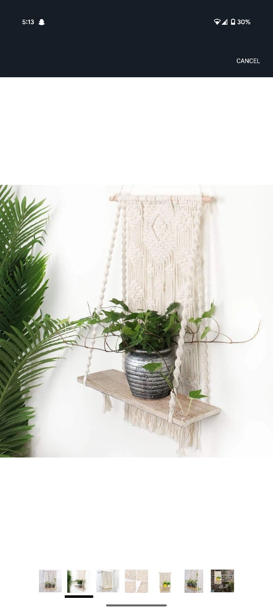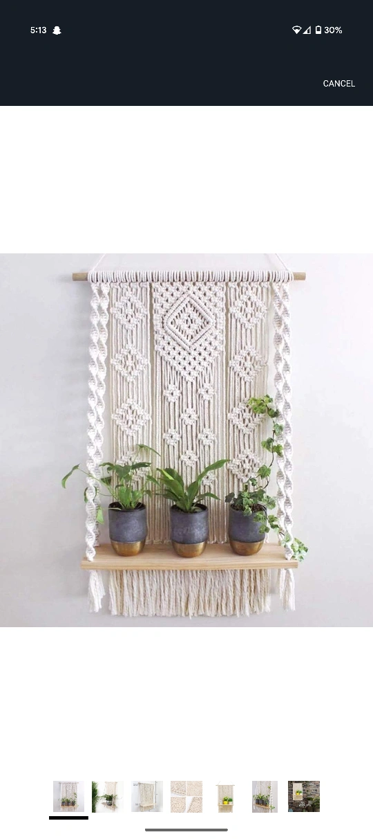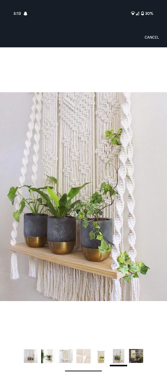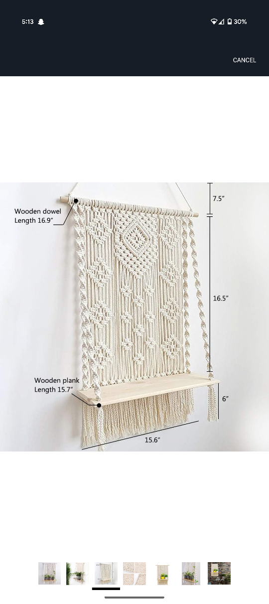 This macrame wall hanging shelf is a beautiful and unique way to display your plants or other small items. It features a wooden dowel (16.9" long) and a wooden plank (15.7" long). The overall dimensions are approximately 15.6" wide, 16.5" high, and 7.5" deep. It's perfect for adding a touch of bohemian style to any room