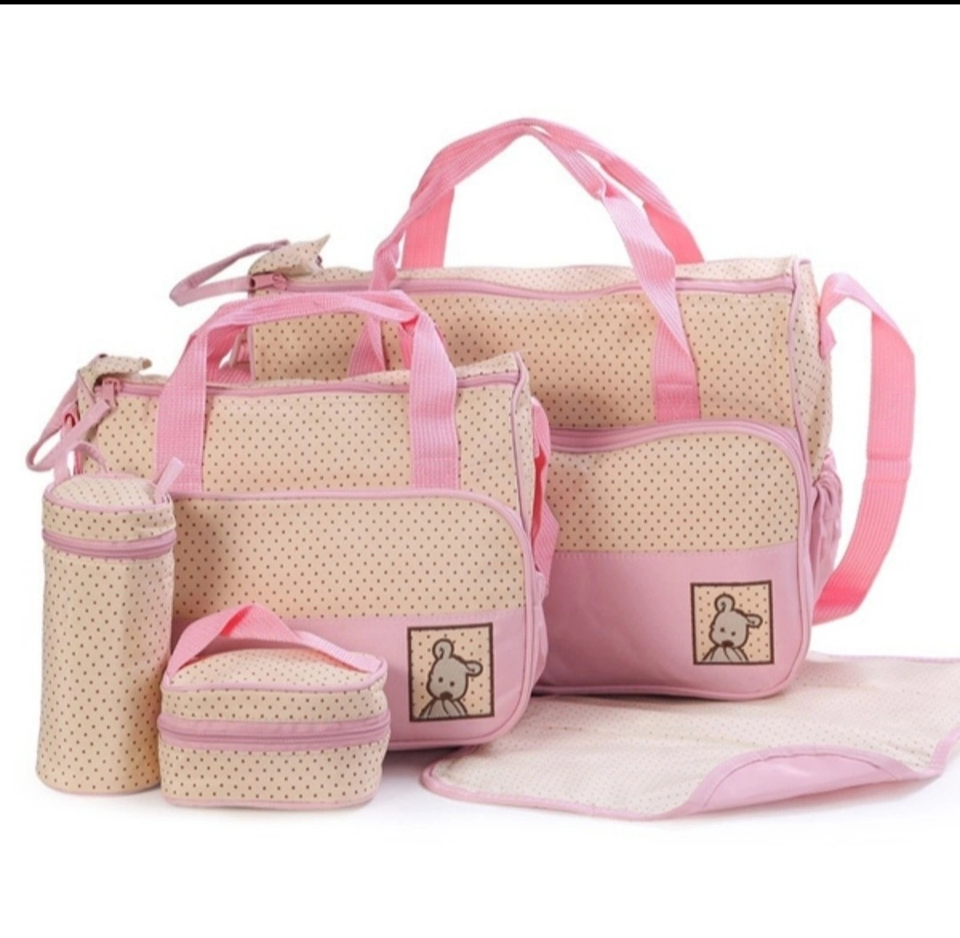 This adorable 5-piece baby diaper bag set is perfect for new parents! It features a charming pink polka dot design and includes various sizes of bags to keep all your baby essentials organized. The set includes a large diaper bag, a medium tote, a bottle holder, a small food container, and a changing pad. It's brand new and ready for a new home!