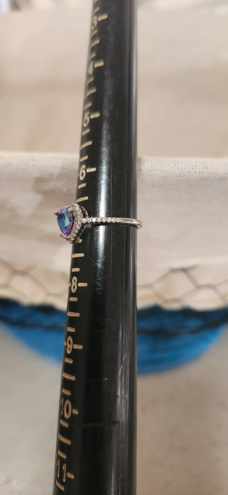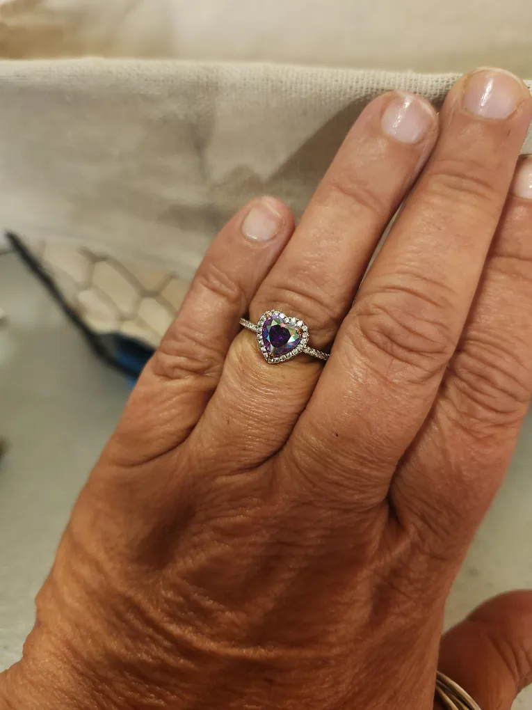 This is a lovely sterling silver heart-shaped ring with a colourful stone and clear stone accents. It's is in new condition without tags, no missing stones, and ready for a new home!