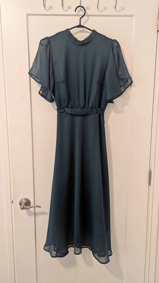 Dark Green Chiffon dress (Shein). Doesn't have tags but has never been worn. Ties at the neck and waist, Midi length. Size S/M. Perfect for fall/winter wedding!