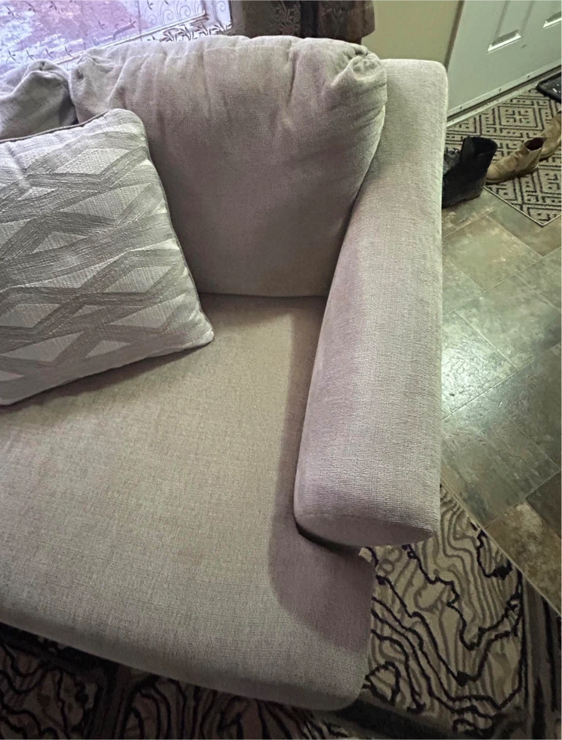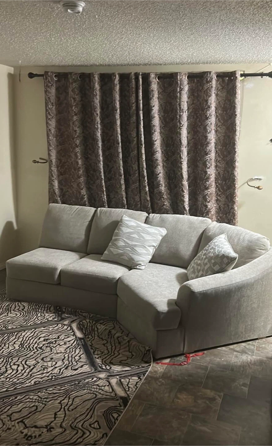 Comfortable beige colour sectional sofa. It comes with two decorative throw pillows featuring a patterned design. Upholstered in a durable fabric material. Its neutral colour makes it easy to match any decor.