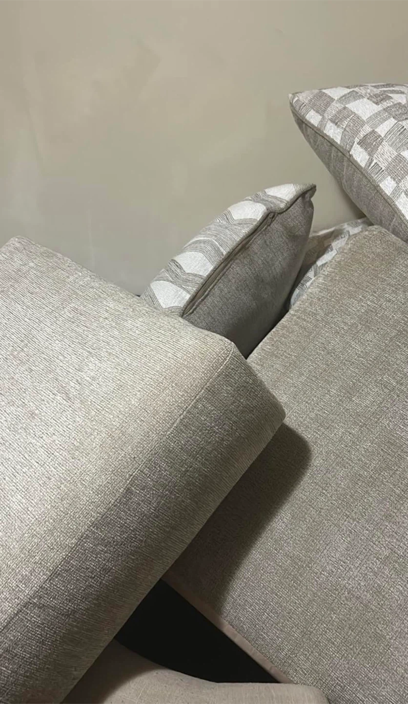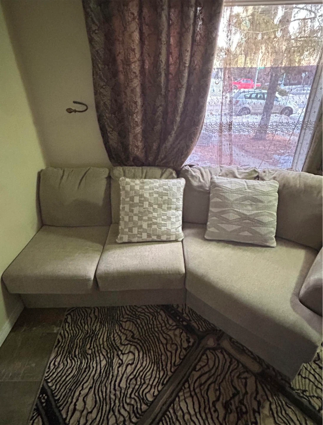 Comfortable beige colour sectional sofa. It comes with two decorative throw pillows featuring a patterned design. Upholstered in a durable fabric material. Its neutral colour makes it easy to match any decor.