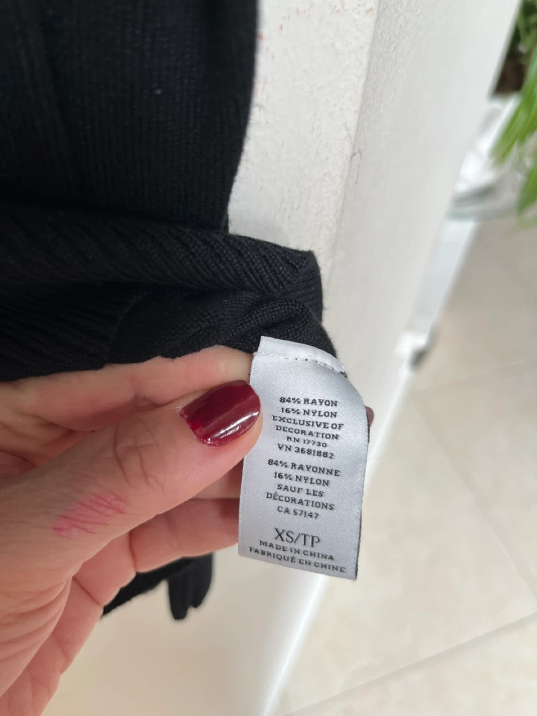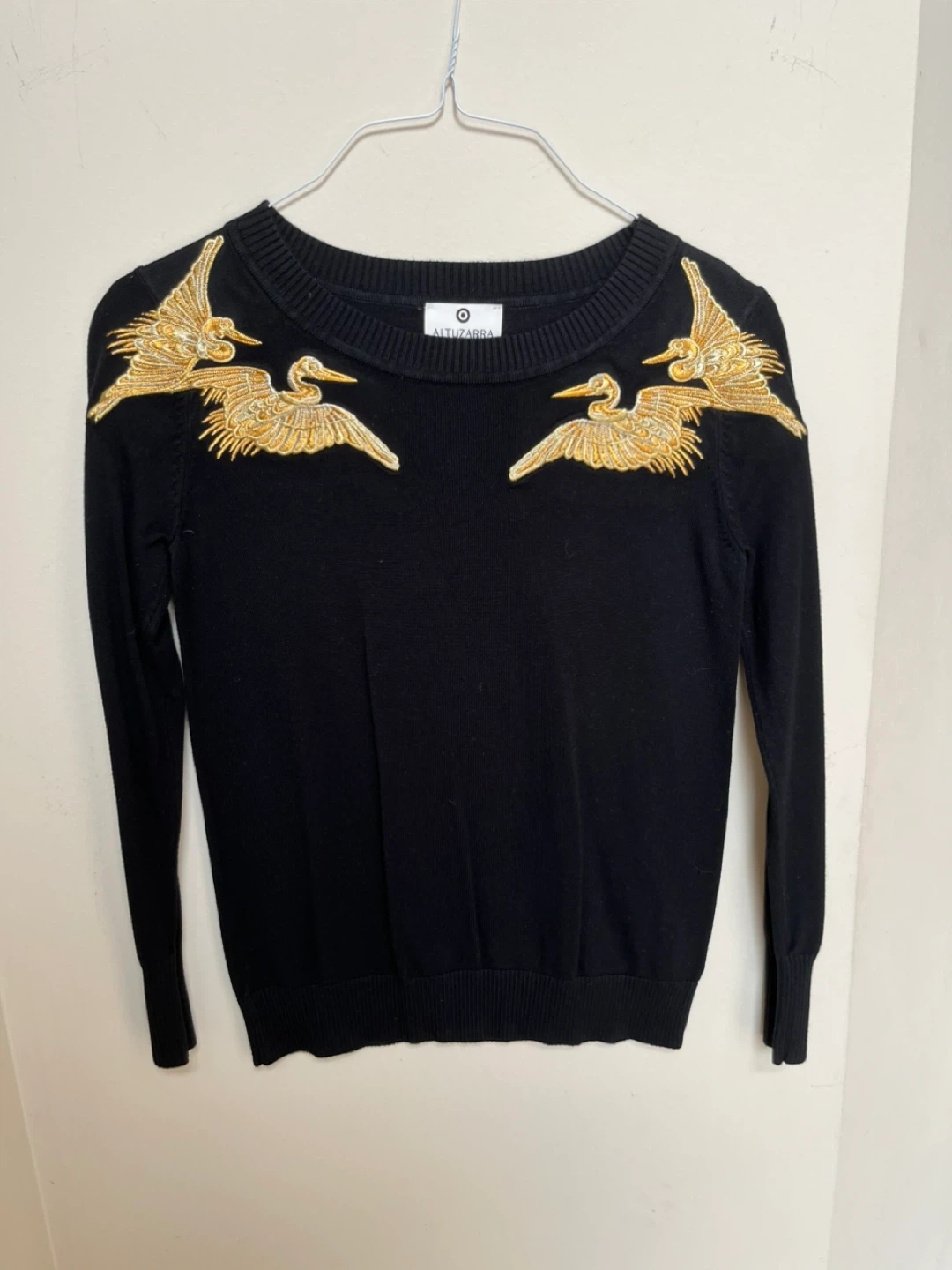 This black sweater features a crew neck and intricate gold crane embroidery on the shoulders. It's made from a blend of rayon and nylon. The size is XS/TP.
