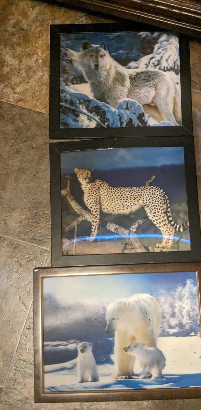 Set of three framed pictures. Includes a wolf, a cheetah, and a polar bear family. These pictures are a simple way to bring nature to your home, creating a serene environment.