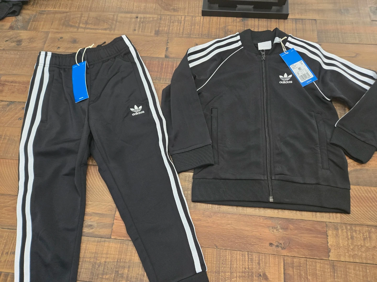 NEW WITH TAGS - Black Adidas tracksuit set with iconic three stripes. Includes a full-zip jacket and matching pants. Perfect for active kids!