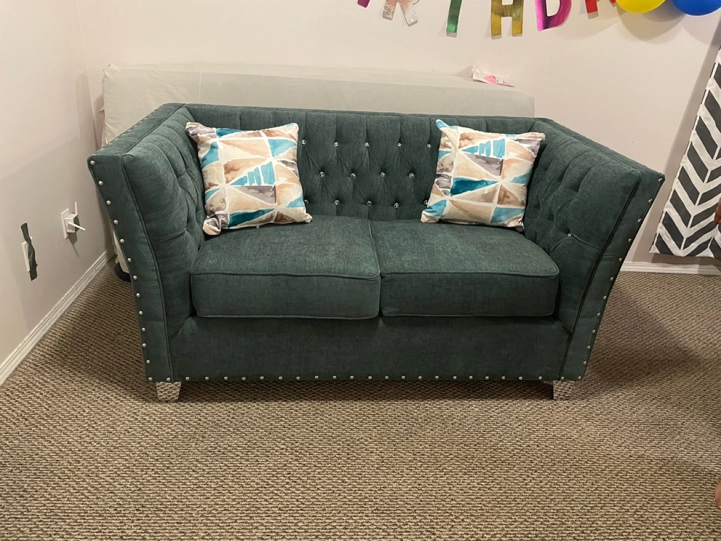 Elegant Teal Velvet Loveseat with Crystal Buttons .Beautiful teal velvet loveseat. Features crystal button tufting and nailhead trim. Sleek and stylish design. Perfect for small spaces.