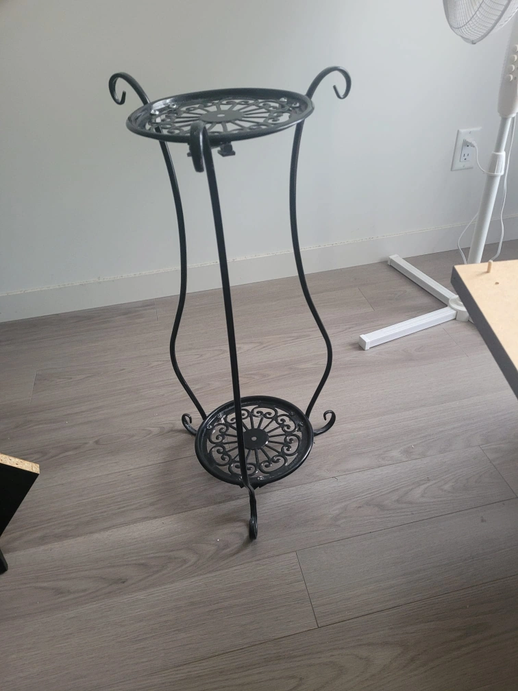 Selling a black metal plant stand. It's perfect for adding a touch of elegance to your indoor plants. The stand has a decorative design on both the top and bottom tiers, providing a stylish display for your favourite plants. it can hold 2 plants.