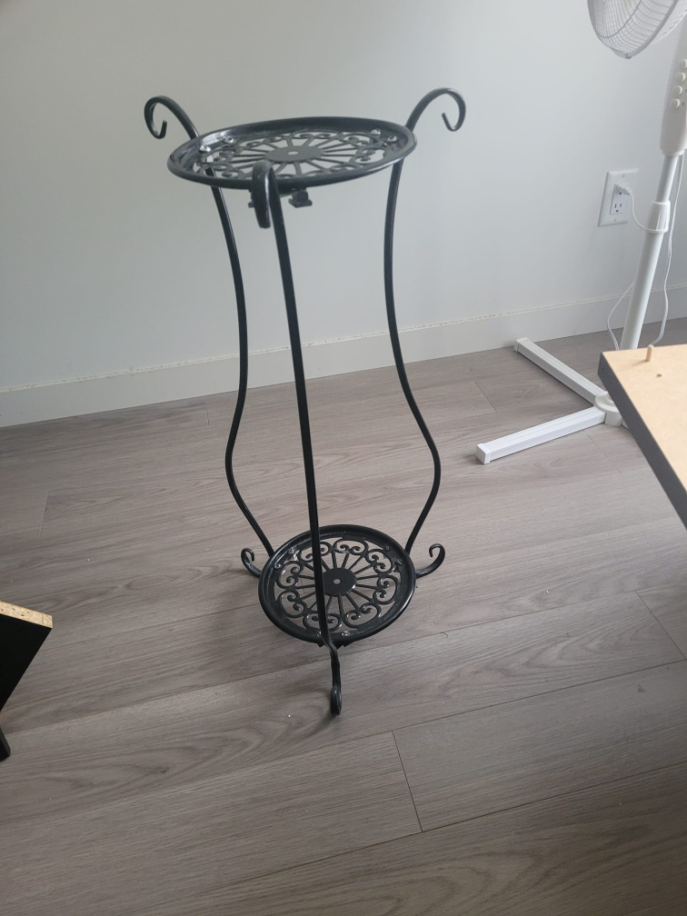 Selling a black metal plant stand. It's perfect for adding a touch of elegance to your indoor plants. The stand has a decorative design on both the top and bottom tiers, providing a stylish display for your favourite plants. it can hold 2 plants.