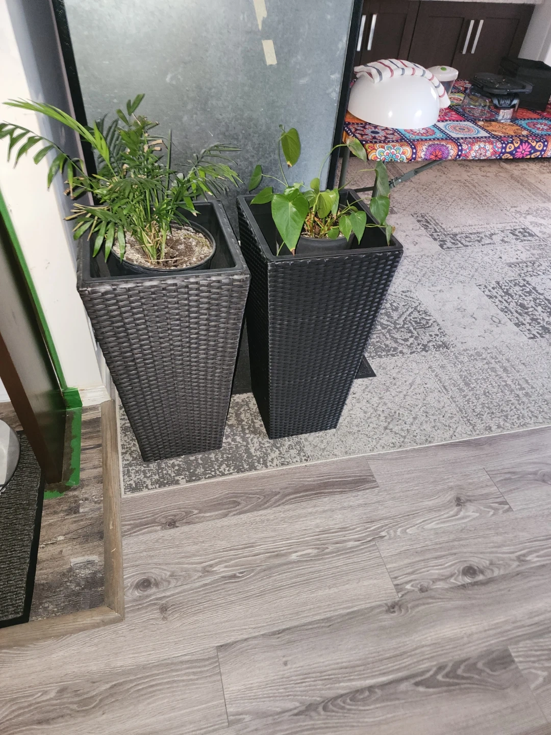 Two tall black wicker-style planters. These planters have a textured finish and are great for adding greenery to your space. They're suitable for indoor or outdoor use. The dimensions are approximately 10" x 10" at the base and 24" tall.