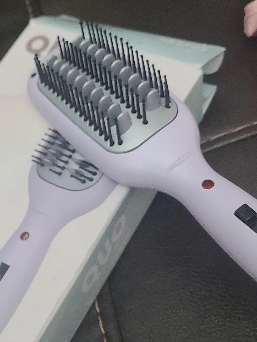 This Quo hair straightening brush is a convenient tool for smoothing hair. It's a lilac colour with an indicator light and on/off switch. The bristles are designed to help detangle and straighten.